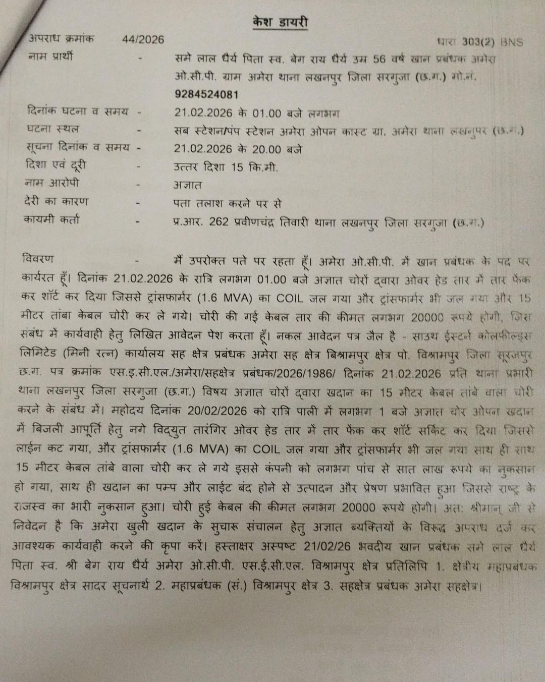 जिससे खदान में लाइन कट गया और ट्रांसफार्मर का (1.6 MVA) Coil सहित ट्रांसफार्मर जल गया। अज्ञात चोरों के द्वारा 15 मी. तांबे वाला केबल तार चोरी कर लिया तांबा केवल की कीमत लगभग ₹20000 बताई जा रही है। ट्रांसफार्मर के जल जाने से खदान का पंप और लाइट बंद होने से उत्पादन और प्रेषण प्रभावित हुआ है। कार्य प्रभावित होने और ट्रांसफार्मर के जलने से कंपनी को 5 से 7 लाख रुपए का नुकसान हुआ है। प्रार्थी की रिपोर्ट पर लखनपुर पुलिस धारा 303(2 ) बीएनएस के तहत अपराध दर्ज करते हुए मामले की जांच में जुटी है।