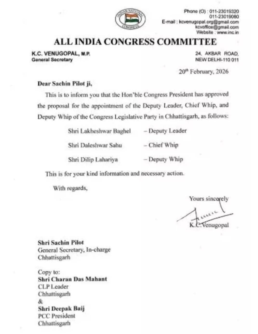 इसी क्रम में कांग्रेस विधायक दल में श्री लखेश्वर बघेल को उपनेता, श्री डलेश्वर साहू को मुख्य सचेतक एवं श्री दिलीप लहरिया को उप सचेतक नियुक्त किया गया है