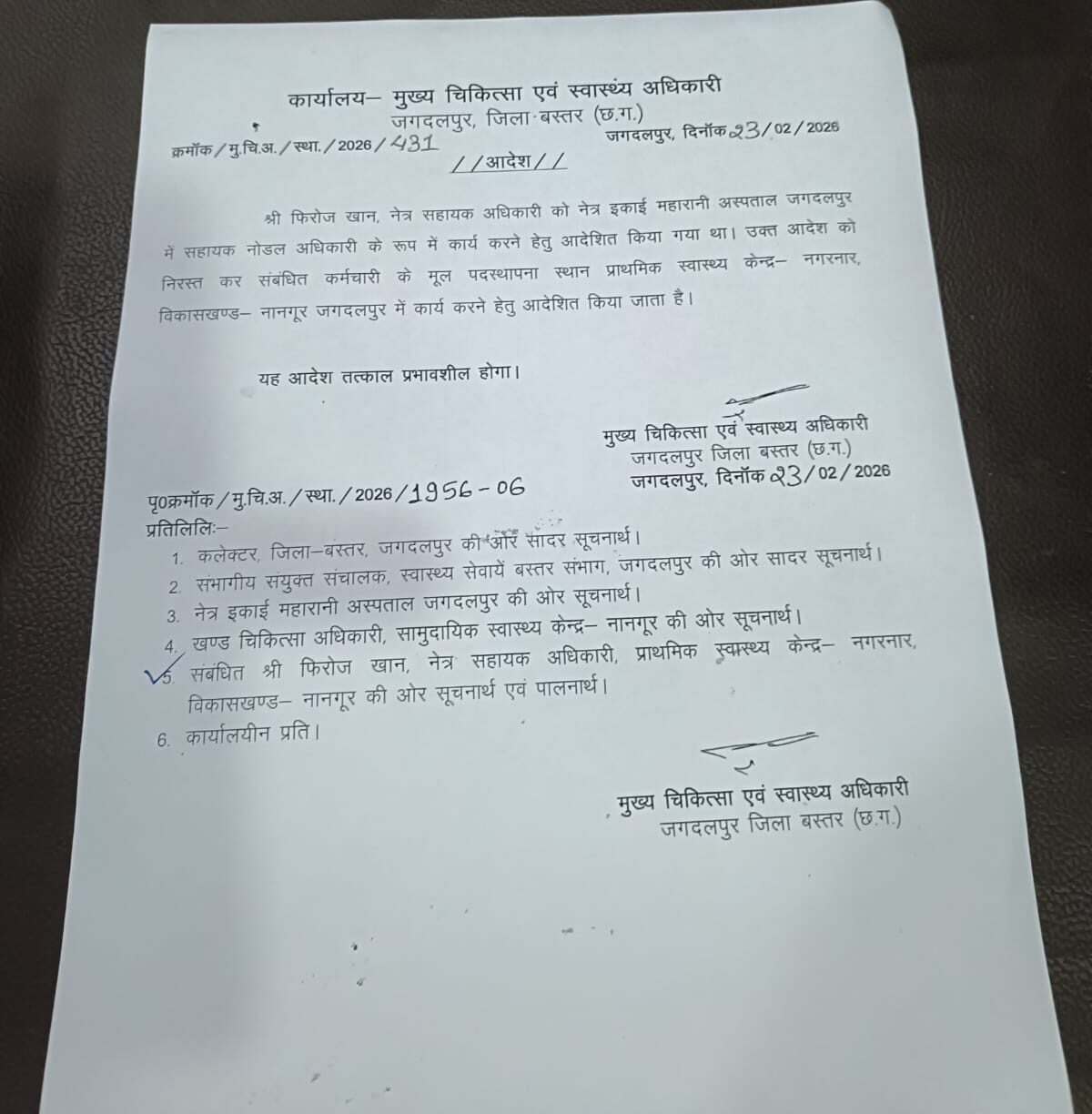 जगदलपुर। महारानी जिला चिकित्सालय जगदलपुर में बवाल मचाने और महिला कर्मियों से गाली गलौज करने वाले नेत्र सहायक अधिकारी पर अंततः कार्रवाई कर दी गई है। बस्तर. के मुख्य जिला चिकित्सा एवं स्वास्थ्य अधिकारी ने उन्हें उनके मूल पदास्थपना वाले प्राथमिक स्वास्थ्य केंद्र के लिए वापस रवाना कर दिया है।