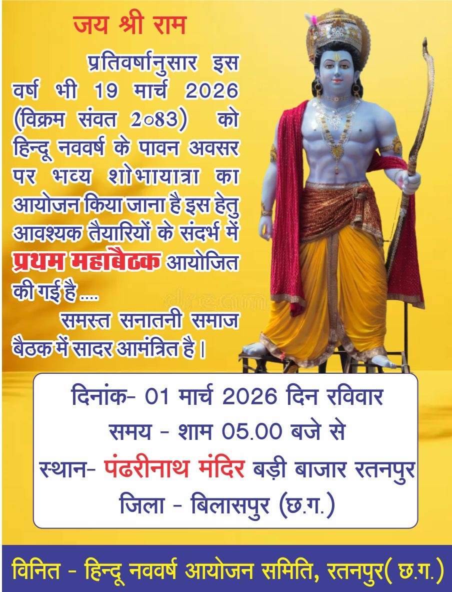 विमल सोनी/रतनपुर। हिन्दू नववर्ष 2026 (विक्रम संवत 2083) के भव्य आयोजन को लेकर नगर में तैयारियां प्रारंभ हो गई हैं। इसी कड़ी में स्थानीय पंढरी नाथ मंदिर में रविवार, 1 मार्च को एक अति आवश्यक बैठक आयोजित की गई है।