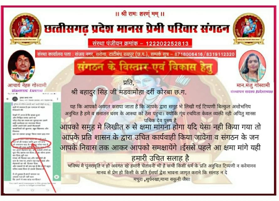 किसी भी जाति धर्म और समाज के ऊपर ग़लत टिप्पणी करना, अशोभनीय शब्द एवं पाखंड जाती जैसे शब्दों का प्रयोग करना ग़लत है, इसके लिए संबंधित समाज संगठन एवं कानून द्वारा उचित कार्रवाई की जा सकती है, इसी क्रम में बहादुर सिंह नाम का व्यक्ति निवासी ग्राम मडवामौहा दर्री जिला कोरबा द्वारा सनातनियों के आराध्य एवं ईष्ट गोस्वामी तुलसीदास जी जो कि रामायण के रचयिता हैं, उनको एक सामाजिक वटसप ग्रुप में पाखंड जाती कहकर संबोधित किया गया है, इससे उस व्यक्ति कि बुद्धि और ज्ञान की जानकारी मिलती है कि ओ व्यक्ति अन्य समाज धरम के लिए क्या सोंच विचार रखता है, इसके विरोध में छत्तीसगढ़ मानस प्रेमी परिवार संगठन पं. क्र. 122202252813 संस्थापक अध्यक्ष द्वारा चेतावनी नोटिस जारी किया गया है जिसमें बहादुर सिंह मडवामौहा को गोस्वामी जात पर पाखंड शब्द संबोधन के लिए माफी मांगने/लिखने कहा गया है, जहां माफ़ी नहीं लिखने कि स्थिति में भविष्य में संगठन द्वारा उसके खिलाफ थाना में शिकायत दर्ज एवं संगठन द्वारा भी कार्यवाही की जायेगी जिसके लिए वह स्वयं जिम्मेदार होगा।