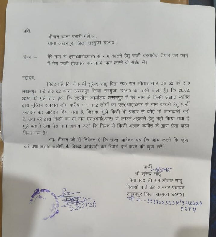 लखनपुर थाना क्षेत्र के निवासी सुरेंद्र साहू पिता स्वर्गीय राम अवतार साहू उम्र 52 वर्ष वार्ड क्रमांक 2 नगर पंचायत लखनपुर निवासी के नाम से विशेष ज्ञानपीठ परीक्षण फिर मतदाता सूची से नाम कटवाने हेतु फर्जी दस्तावेज तैयार कर फॉर्म में फर्जी हस्ताक्षर कर फॉर्म जमा करने के मामले में प्राची सुरेंद्र साहू ने लखनपुर थाने में रिपोर्ट दर्ज कराने आवेदन दिया है ज्ञापन में उल्लेखनीय है कि प्राची सुरेंद्र साहू को 26 फरवरी को ज्ञात हुआ की तहसील कार्यालय लखनपुर में उनके नाम से किसी अज्ञात व्यक्ति के द्वारा विशेष मुस्लिम समुदाय के करीब 111 12 लोगों का एस ए आर मतदाता सूची में नाम काटने हेतु फर्जी हस्ताक्षर कर आवेदन दिया गया था जबकि उनके द्वारा किसी तरह का एस ए आर में नाम काटने हटाने हेतु कोई आवेदन नहीं दिया गया था जिसे लेकर उन्होंने थाना प्रभारी को आवेदन देकर अज्ञात आरोपी के विरुद्ध रिपोर्ट दर्ज कर का और कार्रवाई किए जाने की मांग की गई है।