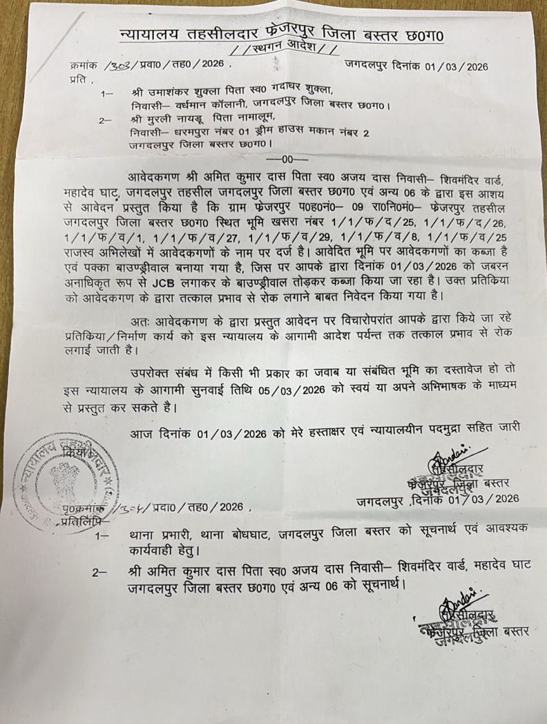 मामला जगदलपुर तहसील अंतर्गत राजस्व निरीक्षक मंडल फ्रेजरपुर के पटवारी हल्का नंबर 09 के खसरा नंबर 1 के विभिन्न भूखंडों को लेकर विवाद से जुड़ा हुआ है। तहसीलदार द्वारा वर्धमान कॉलोनी जगदलपुर निवासी अनावेदक उमाशंकर शुक्ला और मुरली नायडू के खिलाफ जारी स्थगन आदेश में कहा गया है कि उक्त भूखंड राजस्व अभिलेख में शिव मंदिर वार्ड निवासी अमित कुमार दास एवं अन्य छह लोगों के नाम पर दर्ज हैं। इन भूखंडों पर आवेदकों ने बाउंड्री वॉल का निर्माण कराया था, जिसे आज 1 मार्च 2026 को आनवेदकों द्वारा जेसीबी से तोड़ कर भूखंडों पर कब्जा किया जा रहा है। आवेदक ने उक्त प्रक्रिया पर रोक लगाने के लिए आवेदन किया है। आवेदन पर विचारण उपरांत प्रतिक्रिया और निर्माण पर आगामी आदेश तक तत्काल प्रभाव से रोक लगाई जाती है। अगर आपके पास उक्त जमीन से संबंधित कोई वैध दस्तावेज हैं, तो आगामी 5 मार्च को स्वयं अथवा अपने वकील के माध्यम से तहसील न्यायालय में प्रस्तुत कर सकते हैं। इस तरह के विवाद तो सामान्य बात हैं, मगर इस मामले में बड़ी बात यह है कि कथित अनावेदकों ने आज 1 मार्च को कब्जे की कोशिश की, 1 मार्च को रविवार छुट्टी के आवेदक ने तहसील न्यायालय में आवेदन किया और तहसीलदार ने कार्यालय खोल कर स्थगन आदेश भी जारी कर दिया। रविवार के साप्ताहिक अवकाश के दिन दिखाई गई इस प्रशासनिक तत्परता ने नई बहस को जन्म दे दिया है। सूत्र बताते हैं कि जमीन दलाल और भू माफिया का गिरोह अपनी व्यक्तिगत धौंस जमा कर राजस्व विभाग के अधिकारियों से कभी भी कोई भी आदेश निकलवा लेते हैं, जबकि साधारण लोगों को अपने हक के लिए महीनों चक्कर लगाने पड़ते हैं।