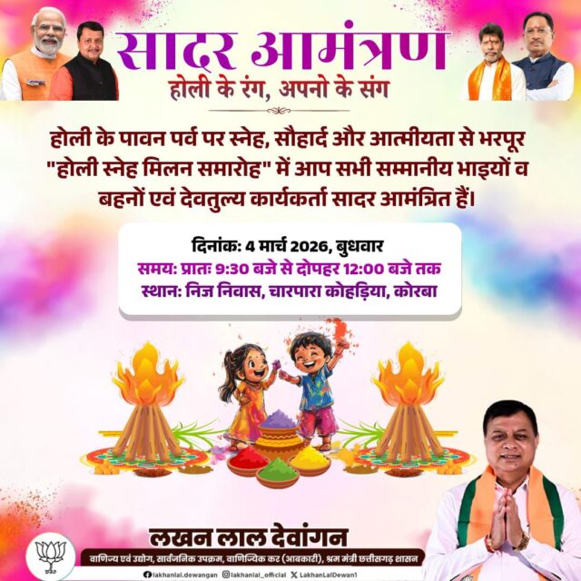 नगर विधायक और कैबिनेट मंत्री श्री लखन लाल देवांगन के चारपारा कोहड़िया स्थित निवास में 4 मार्च की सुबह 9:30 बजे से 12 बजे तक होली स्नेह मिलन समारोह का आयोजन रखा गया है। प्रति वर्ष की भांति मंत्री श्री देवांगन के निवास पर होली मिलन समारोह में अधिक संख्या में कार्यकर्ता और आम जन मानस शामिल होंगे। मंत्री श्री देवांगन ने सभी सम्मानीय लोगों एवं कार्यकर्ताओं, सामाजिक संगठनों के पदाधिकारियों को होली मिलन समारोह में शामिल होने का आग्रह किया है।