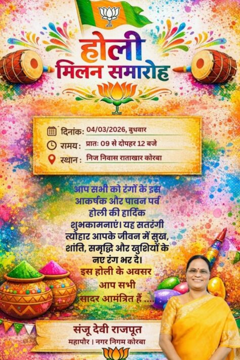रंगों के पावन पर्व होली के उपलक्ष्य में 4 मार्च 2026, बुधवार को प्रातः 9 बजे से दोपहर 12 बजे तक कोरबा के राताखार स्थित निवास पर भव्य होली मिलन समारोह का आयोजन किया जाएगा। इस रंगारंग आयोजन की मेजबानी नगर निगम कोरबा की महापौर संजू देवी राजपूत द्वारा की जाएगी।