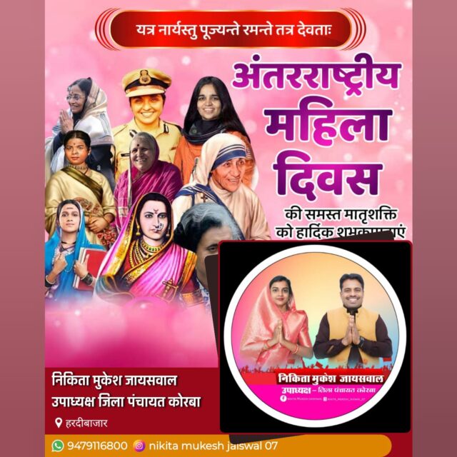 अंतरराष्ट्रीय महिला दिवस के अवसर पर जिला पंचायत कोरबा की उपाध्यक्ष श्रीमती निकिता मुकेश जायसवाल ने जिले सहित प्रदेश की सभी महिलाओं को हार्दिक शुभकामनाएं और बधाई दी।