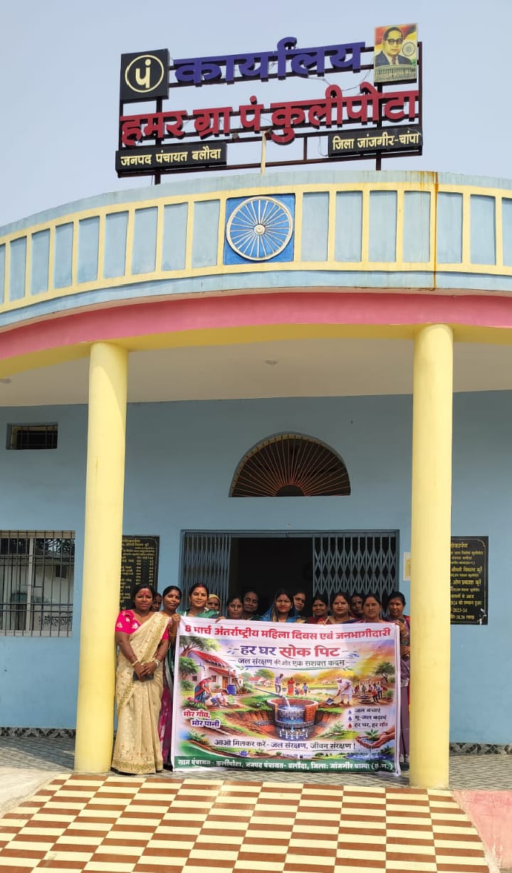 जांजगीर-चांपा, 08 मार्च 2026। कलेक्टर श्री जन्मेजय महोबे के निर्देशन एवं जिला पंचायत सीईओ श्री गोकुल रावटे के मार्गदर्शन में जिले में “मोर गांव – मोर पानी” अभियान के अंतर्गत जल संरक्षण को जन-आंदोलन बनाने की दिशा में विशेष पहल की जा रही है। विश्व महिला दिवस के अवसर पर जिलेभर के गांवों में जल संचय जनभागीदारी अभियान चलाया गया, जिसमें महिलाओं ने बढ़-चढ़कर भाग लेते हुए जल संरक्षण का संकल्प लिया। अभियान के तहत गांव-गांव में जनभागीदारी से सोक पिट निर्माण का कार्य किया जा रहा है। इसके साथ ही ग्रामीणों को रिचार्ज पिट, सोखता गड्ढा तथा रेन वॉटर हार्वेस्टिंग जैसी जल संरक्षण संरचनाओं के निर्माण के लिए प्रेरित किया गया, ताकि वर्षा जल का अधिक से अधिक संचयन कर भू-जल स्तर को बढ़ाया जा सके।
