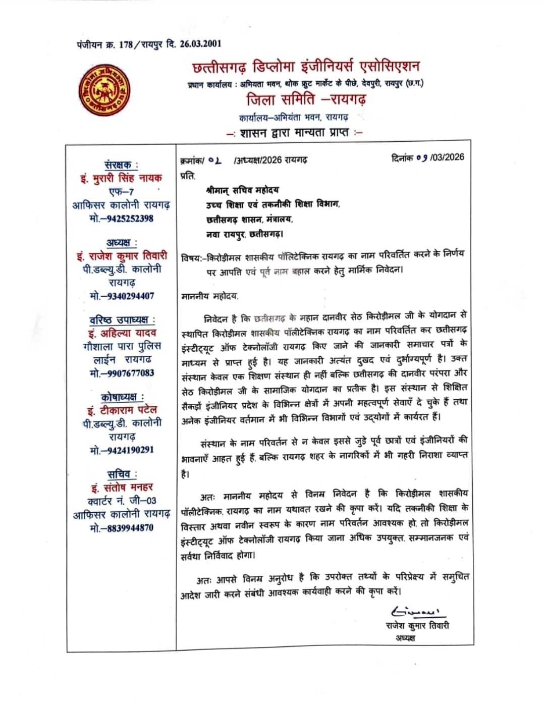 रायगढ़। छत्तीसगढ़ डिप्लोमा इंजीनियर्स एसोसिएशन, जिला समिति रायगढ़ ने किरोड़ीमल शासकीय पॉलिटेक्निक रायगढ़ का नाम परिवर्तन किए जाने के निर्णय पर आपत्ति जताते हुए पूर्व नाम बहाल करने की मांग की है। इस संबंध में समिति ने तकनीकी शिक्षा, कौशल विकास एवं रोजगार मंत्री को ज्ञापन भेजकर निर्णय पर पुनर्विचार का आग्रह किया है।