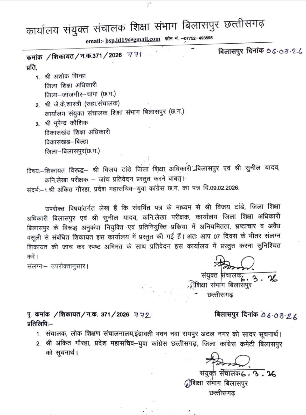जिला शिक्षा विभाग में नियुक्ति, अटैचमेंट और प्रमोशन में कथित भ्रष्टाचार के आरोपों ने अब नया मोड़ ले लिया है। कांग्रेस नेता अंकित गौराहा की शिकायत के बाद संभागीय संयुक्त संचालक शिक्षा आर.पी.आदित्य ने जिला शिक्षा अधिकारी विजय टांडे और स्थापना शाखा के बाबू सुनील यादव के खिलाफ जांच के आदेश जारी किए हैं। इसके लिए तीन सदस्यीय जांच समिति का गठन किया गया है,जिसे सात दिन के भीतर रिपोर्ट प्रस्तुत करने का निर्देश दिया गया है।