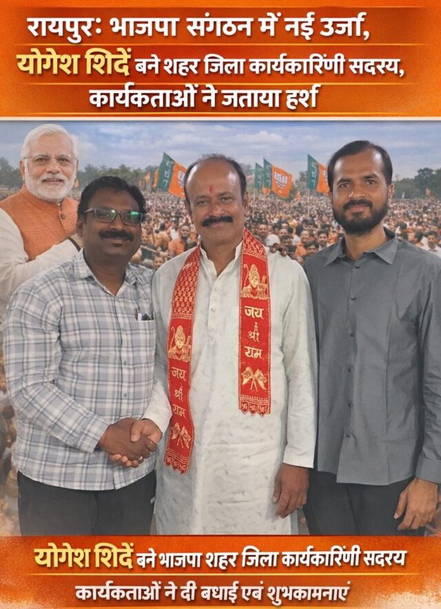 अपनी नियुक्ति पर प्रतिक्रिया देते हुए श्री योगेश शिंदे जी ने कहा, “मैं शीर्ष नेतृत्व और रायपुर भाजपा परिवार का अत्यंत आभारी हूँ कि उन्होंने मुझ पर भरोसा जताया। भाजपा केवल एक राजनीतिक दल नहीं, बल्कि सेवा का माध्यम है। जिला कार्यकारिणी सदस्य के रूप में मेरी प्राथमिकता रायपुर शहर के प्रत्येक वार्ड में संगठन को मजबूत करना और माननीय प्रधानमंत्री नरेंद्र मोदी जी एवं मुख्यमंत्री जी के विकास कार्यों को जन-जन तक पहुँचाना होगी।”