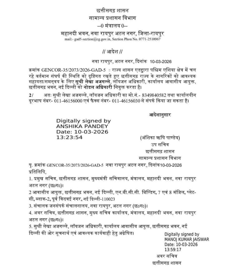 पश्चिम एशिया (Middle East) में जारी वर्तमान संघर्ष और युद्ध की स्थिति को देखते हुए छत्तीसगढ़ सरकार ने बड़ा कदम उठाया है। मुख्यमंत्री के निर्देश पर सामान्य प्रशासन विभाग ने प्रदेश के नागरिकों की सुरक्षा और सहायता के लिए नोडल अधिकारी की नियुक्ति की है।