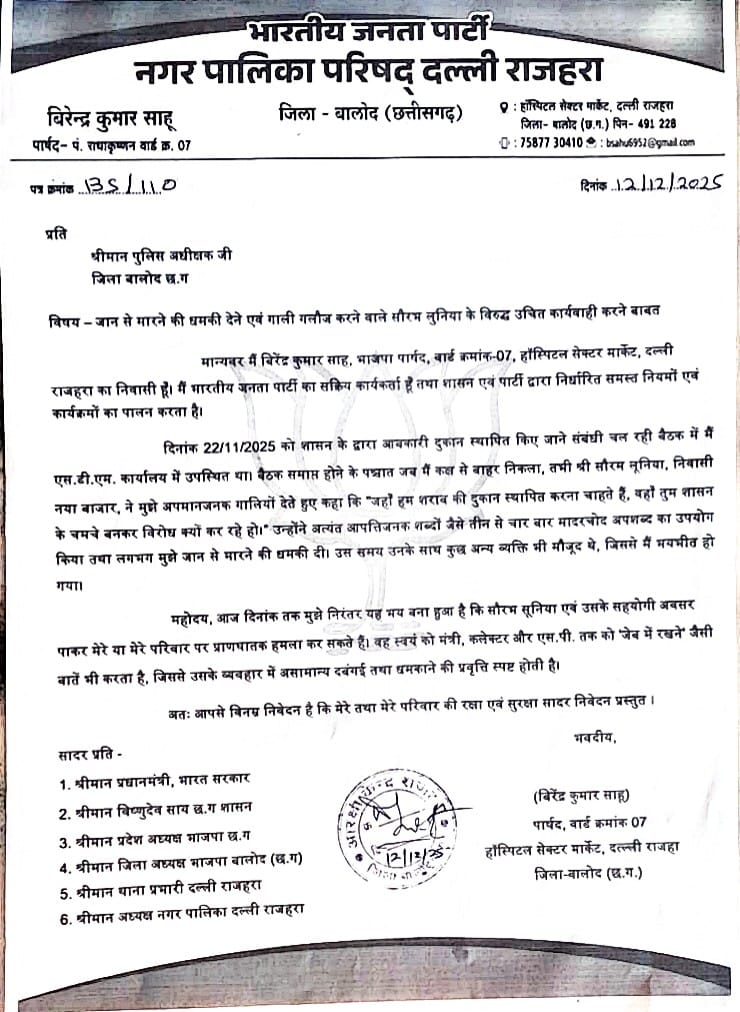 भिलाई। दल्ली राजहरा के वार्ड क्रमांक 07 के भाजपा पार्षद वीरेंद्र साहू पर वार्ड में ही अज्ञात आरोपियों द्वारा जानलेवा हमला कर दिया गया। हमले में गंभीर रूप से घायल होने के बाद उन्हें तत्काल भिलाई के स्पर्श हॉस्पिटल में भर्ती कराया गया है, जहां उनका उपचार जारी है।