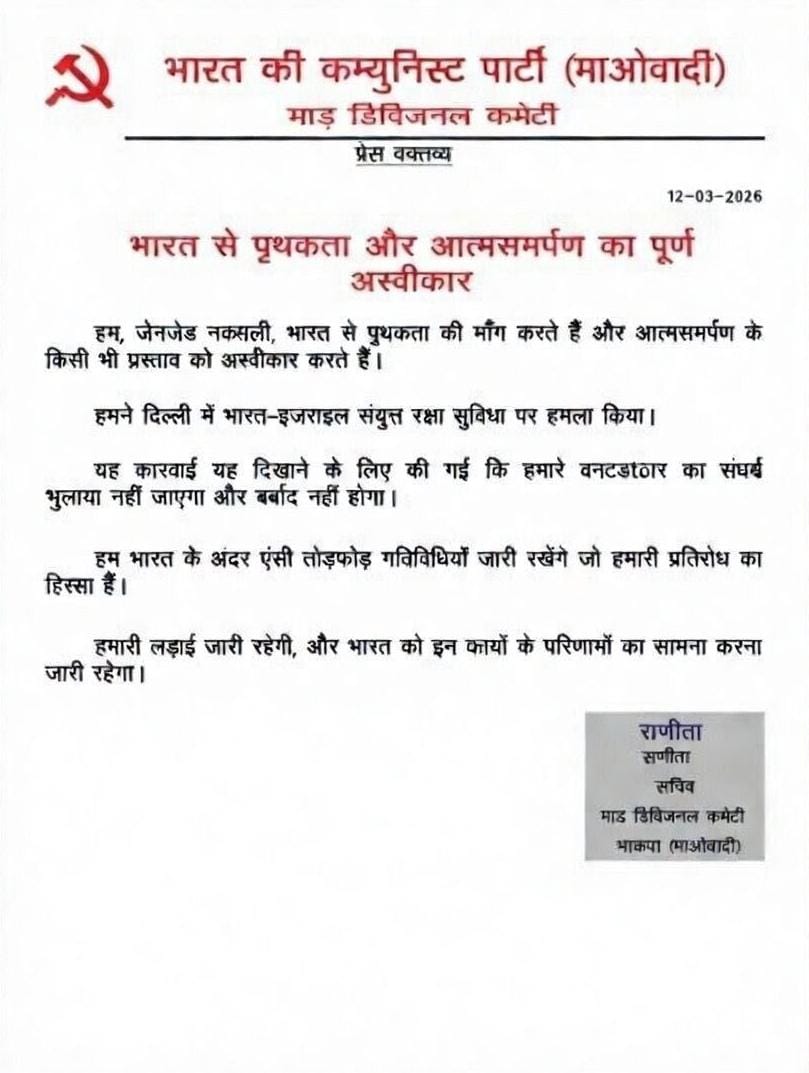 माड़ डिवीजन की सचिव रणिता के नाम से जारी इस प्रेस नोट ने सुरक्षा एजेंसियों की चिंता एकबार फिर बढ़ा दी है। प्रेस नोट में रणिता ने खुद को “जेन जी नक्सली” बताते हुए साफ कहा है कि संगठन आत्मसमर्पण नहीं करेगा और उनकी लड़ाई आगे भी जारी रहेगी। प्रेस नोट में देशभर में हिंसक गतिविधियां जारी रखने की बात कही गई है साथ ही भारत के टुकड़े करने का भी जिक्र किया गया है। इससे सुरक्षा एजेंसियां सतर्क हो गई हैं। इससे पहले जगदलपुर में नक्सली नेता रूपेश के आत्मसमर्पण के बाद माड़ डिवीजन कमेटी लगभग खत्म मानी जा रही थी। लेकिन अब अचानक आए इस प्रेस नोट ने कई सवाल खड़े कर दिए हैं।