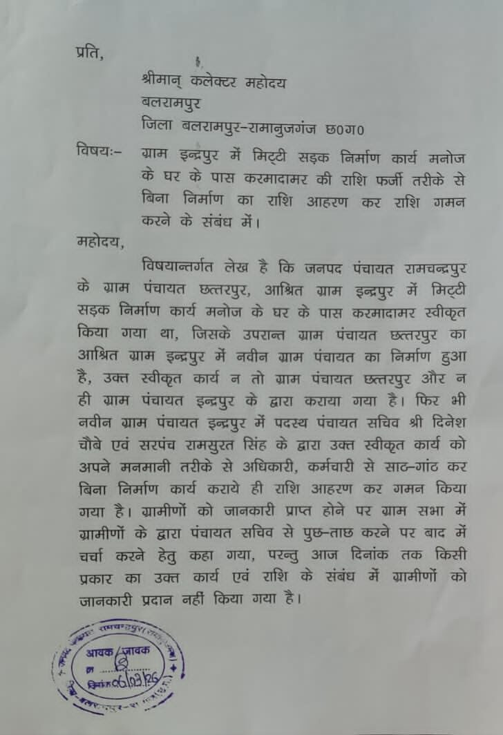 मामला बलरामपुर जिले के रामचंद्रपुर जनपद पंचायत अंतर्गत ग्राम पंचायत इंदरपुर का है। यहां मनरेगा के तहत स्वीकृत चेक डेम निर्माण कार्यों को लेकर ग्रामीणों ने गंभीर आरोप लगाए हैं। ग्रामीणों का आरोप है कि कार्यों का चयन ग्राम सभा समिति की स्वीकृति के बिना ही कर लिया गया। ग्रामीणों ने इसकी शिकायत कलेक्टर के साथ-साथ जनपद पंचायत सीईओ से भी की थी, जिसके बाद मामले में जांच के लिए टीम गठित की गई।