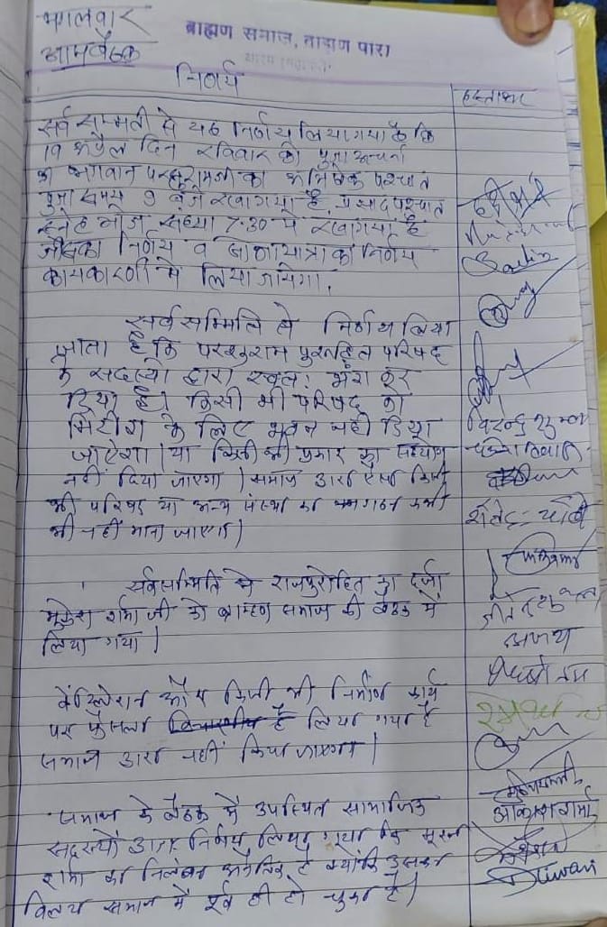 इसके साथ ब्राह्मण समाज नें स्पष्ट किया है कि समाज की कोई अन्य संस्था ,समिति या परिषद नहीं है और न ही ब्राह्मण समाज ऐसी किसी समिती परिषद का गठन चाहता है,यदि इस संबंध में कोई भी व्यक्ति विशेष समिति परिषद का गठन निर्माण करती है तो समाज उनका सहयोग नहीं करेंगी केवल आरंग ब्राह्मण समाज ही प्रमुख इकाई होंगी जो सभी प्रकार के त्यौहार व्रत आदि कि जानकारी समय समय पर प्रकाशित करती रहेंगी। विगत वर्ष परशुराम पुरोहित परिषद का गठन हुआ था जिसे उपस्थित सदस्यों के बहुमत के साथ भंग कर उसका विलय ब्राह्मण समाज में कर दिया गया है इसके साथ सूरज शर्मा का पुरोहित परिषद से निलंबन का प्रकाशन जो कहा गया था वह तथ्यहीन भ्रामक व अनैतिक है क्योंकि भंग परिषद कों किसी भी व्यक्ति कों पुनः संचालन का अधिकार ही नहीं है