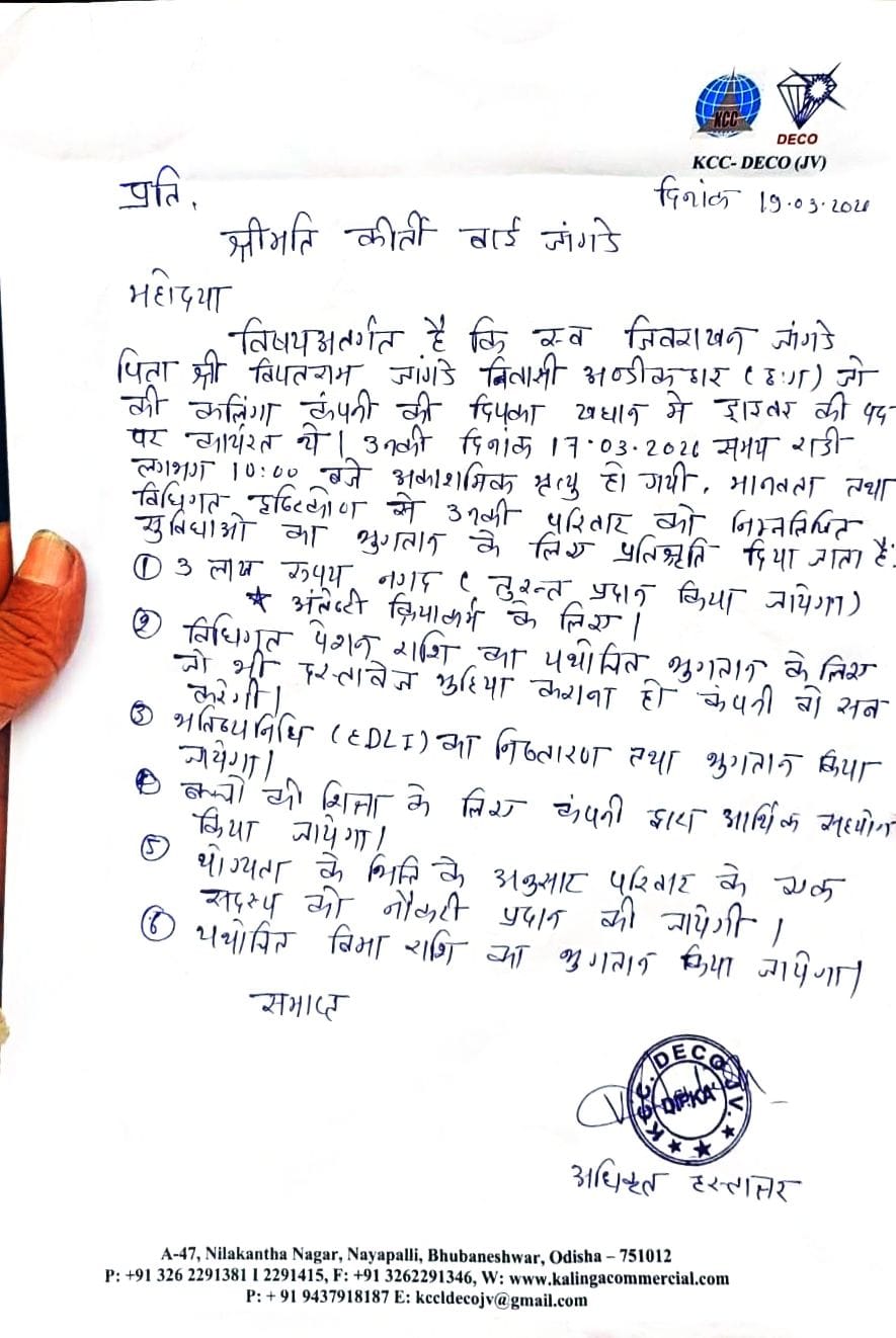 नौकरी मृतक के परिवार के एक सदस्य को कलिंगा कंपनी में नौकरी दी जाएगी।