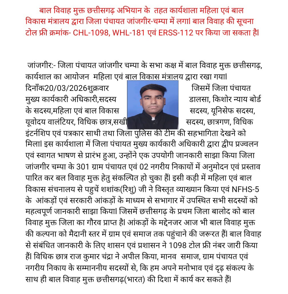 जिला पंचायत जांजगीर चम्पा के सभा कक्ष में बाल विवाह मुक्त छत्तीसगढ़, कार्यशाल का आयोजन महिला एवं बाल विकास मंत्रालय द्वारा रखा गयाl 20/03/2026शुक्रवार जिसमें जिला पंचायत मुख्य कार्यकारी अधिकारी,सदस्, डालसा, किशोर न्याय बोर्ड के सदस्य,महिला एवं बाल विकास सदस्य, यूनिसेफ सदस्य, यूवोदय वालंटियर, विधिक छात्र,सखी सदस्य, छात्रगण, विधिक इंटर्नशिप एवं पत्रकार साथी तथा जिला पुलिस की टीम की सहभागिता देखने को मिलाl इस कार्यशाला में जिला पंचायत मुख्य कार्यकारी अधिकारी द्वारा द्वीप प्रज्वलन एवं स्वागत भाषण से प्रारंभ हुआ, उन्होंने एक उपयोगी जानकारी साझा किया जिला जांजगीर चम्पा के 301 ग्राम पंचायत एवं 02 नगरीय निकायों में अनुमोदन एवं प्रस्ताव पारित कर बल विवाह मुक्त हेतु संकल्पित हो चुका हैंl इसी कड़ी में महिला एवं बाल विकास संचनालय से पहुचें शशांक(रिशु) जी ने विस्तृत व्याख्यान किया एवं NFHS-5 के आंकड़ों एवं सरकारी आंकड़ों के माध्यम से सभागार में उपस्थित सभी सदस्यों को महत्वपूर्ण जानकारी साझा कियाl जिसमें छत्तीसगढ़ के प्रथम जिला बालोद को बाल विवाह मुक्त जिला का गौरव प्राप्त हैl आंकड़ों के मद्देनजर आज भी बाल विवाह मुक्त की कल्पना को मैदानी स्तर में ग्राम एवं समाज तक पहुंचाने की जरूरत हैंl बाल विवाह से संबंधित जानकारी के लिए शासन एवं प्रशासन ने 1098 टोल फ्री नंबर जारी किया हैंl विधिक छात्र राज कुमार चंद्रा ने अपील किया, मानव समाज, ग्राम पंचायत एवं नगरीय निकाय के सम्माननीय सदस्यों से, कि हम अपने मनोभाव एवं दृढ़ संकल्प के साथ ही बाल विवाह मुक्त छत्तीसगढ़(भारत) की दिशा में कार्य कर सकते हैंl