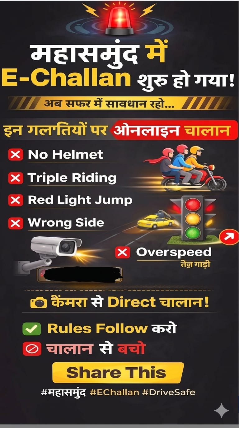 महासमुंद शहर में स्थापित स्मार्ट कैमरों ने बिना हेलमेट वाहन चलाने वाले (हेलमेट वायलेशन) 555 चालकों को ऑटोमैटिक ट्रेस किया है। अब तक की व्यवस्था के अनुसार, महीने में तीन बार नियम तोड़ने पर केवल एक बार चालान काटा जा रहा था, लेकिन अब पुलिस ने नियमों को सख्त कर दिया है।