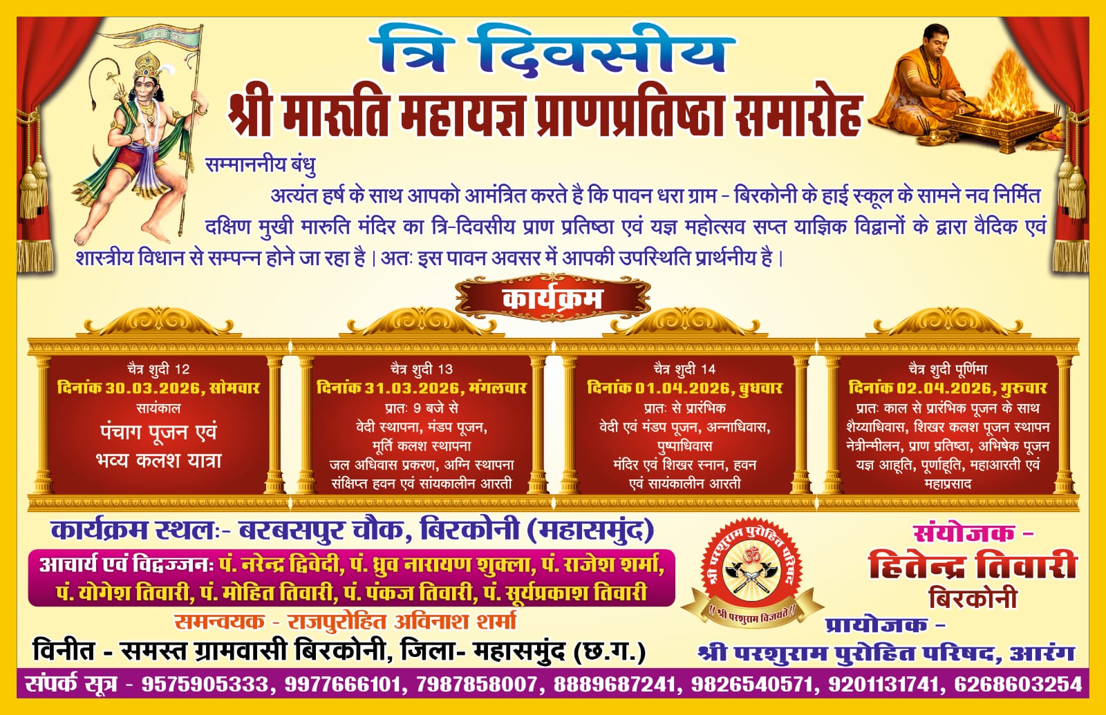 पावन धरा ग्राम बिरकोनी में हाई स्कूल के सामने नव-निर्मित दक्षिण मुखी मारुति मंदिर में त्रि-दिवसीय श्री मारुति महायज्ञ प्राण प्रतिष्ठा समारोह का भव्य आयोजन किया जा रहा है। यह आयोजन वैदिक एवं शास्त्रीय विधि-विधान से संपन्न होगा, जिसमें क्षेत्र के श्रद्धालुओं एवं धर्मप्रेमियों की उपस्थिति अपेक्षित है।