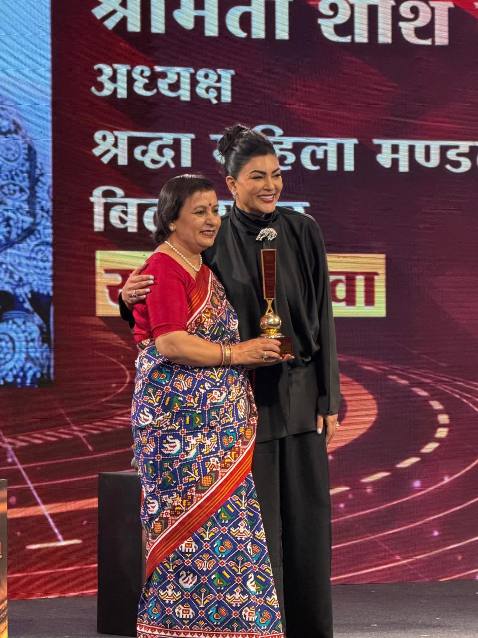 -सुप्रसिद्ध अभिनेत्री एवं पूर्व मिस यूनिवर्स सुश्री सुष्मिता सेन के करकमलों से श्रद्धा महिला मण्डल अध्यक्षा श्रीमती शशि दुहन ने ग्रहण किया सम्मान