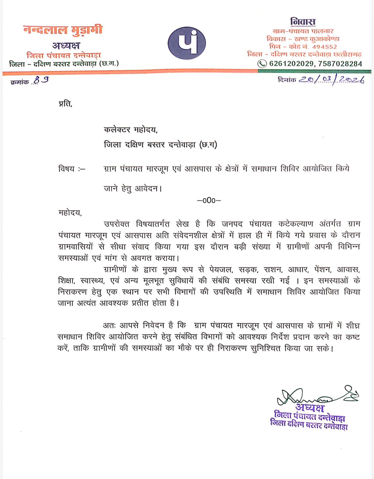 जानकारी के अनुसार, जिला पंचायत अध्यक्ष नंदलाल मुड़ामी ने अपने प्रवास के दौरान मारजूम एवं आसपास के गांवों का दौरा कर ग्रामीणों से सीधा संवाद किया था। इस दौरान उन्होंने उनकी समस्याओं को गंभीरता से लेते हुए कलेक्टर को लिखित आवेदन देकर समाधान शिविर लगाने की मांग की थी। कलेक्टर द्वारा त्वरित संज्ञान लेते हुए संबंधित अधिकारियों को निर्देशित किया गया, जिसके बाद यह शिविर आयोजित किया गया।