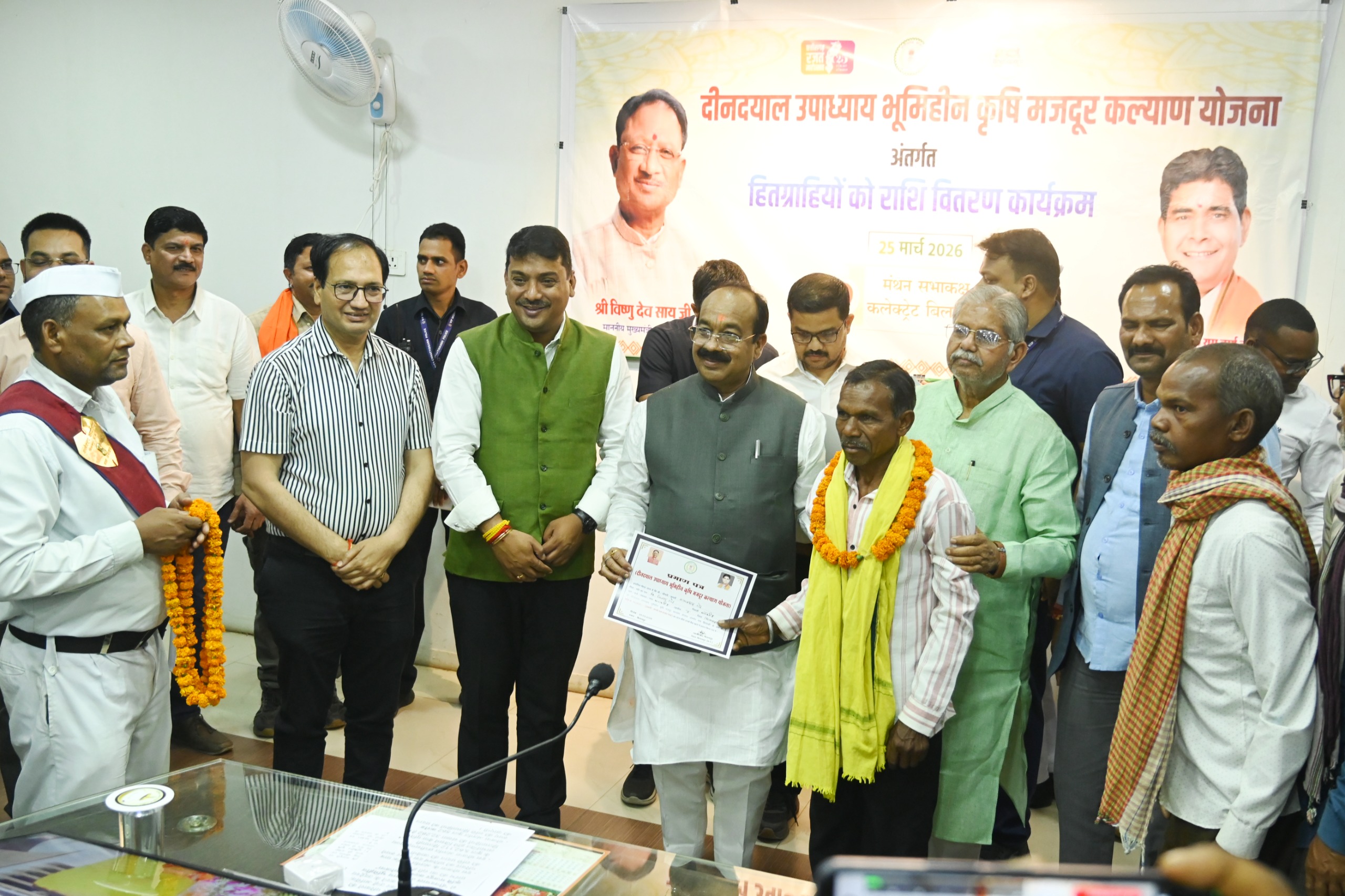 बिलासपुर, 25 मार्च 2026/ दीनदयाल उपाध्याय भूमिहीन कृषि मजदूर कल्याण योजना के अंतर्गत जिला स्तरीय कार्यक्रम का आयोजन आज जिला कार्यालय के मंथन सभाकक्ष में किया गया। कार्यक्रम के मुख्य अतिथि उप मुख्यमंत्री एवं जिले के प्रभारी मंत्री श्री अरुण साव रहे। कार्यक्रम की अध्यक्षता विधायक श्री धरमलाल कौशिक ने की। इस अवसर पर विशेष अतिथि के रूप में विधायक श्री सुशांत शुक्ला तथा जिला पंचायत अध्यक्ष श्री राजेश सूर्यवंशी उपस्थित रहे।