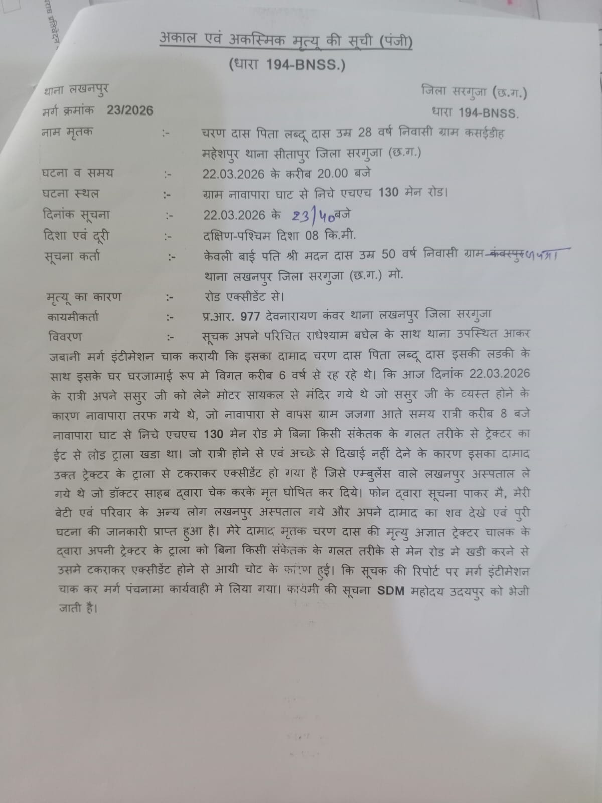 लखनपुर थाना क्षेत्र के अंबिकापुर बिलासपुर नेशनल हाईवे 130 स्थित नवापारा के समीप खड़े ट्रैक्टर से बाइक सवार जा टकराया जिससे उसकी मौत हो गई,वहीं मृतक की पहचान चरणदास पिता लड्डू दास उम्र 28 वर्ष ग्राम महेशपुर थाना सीतापुर निवासी के रूप में हुई है,वही 23 मार्च दिन सोमवार को लखनपुर पुलिस ने शव का पोस्टमार्टम कराकर परिजनों की सुपुर्द किया है,साथ ही मर्ग कायम करते हुए पुलिस मामले की जांच में जुटी है, जानकारी के मुताबिक चरण दास पिता लड्डू दास अपनी पत्नी के साथ घर जमाई के रूप में लगभग 6 वर्ष से ग्राम जजगा में रह रहा था 22 मार्च की रात अपने ससुर को लेने मोटरसाइकिल से मंदिर की तरफ गया हुआ था,ससुर के व्यस्त होने के कारण नवापारा की तरफ घूमने आया नवापारा से वापस ग्राम जजगा आते समय रात लगभग 8 बजे नवापारा घाट के नीचे नेशनल हाईवे 130 रोड में बिना किसी संकेतक के गलत तरीके से ईंट ट्रैक्टर ट्राली खड़ा था बाइक सवार ट्रैक्टर ट्राली से टकराकर घायल हो गया जिसे एंबुलेंस उपचार हेतु लखनपुर अस्पताल लाया जहां डॉक्टर ने उसे मृत घोषित किया है। केवली बाई पति मदन दास उम्र 50 वर्ष निवासी ग्राम जजगा की रिपोर्ट दर्ज कराया है।लखनपुर पुलिस मामले की जांच में जुटी है।
