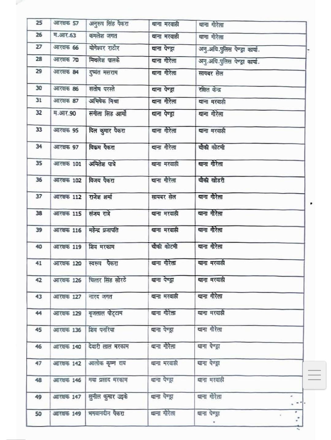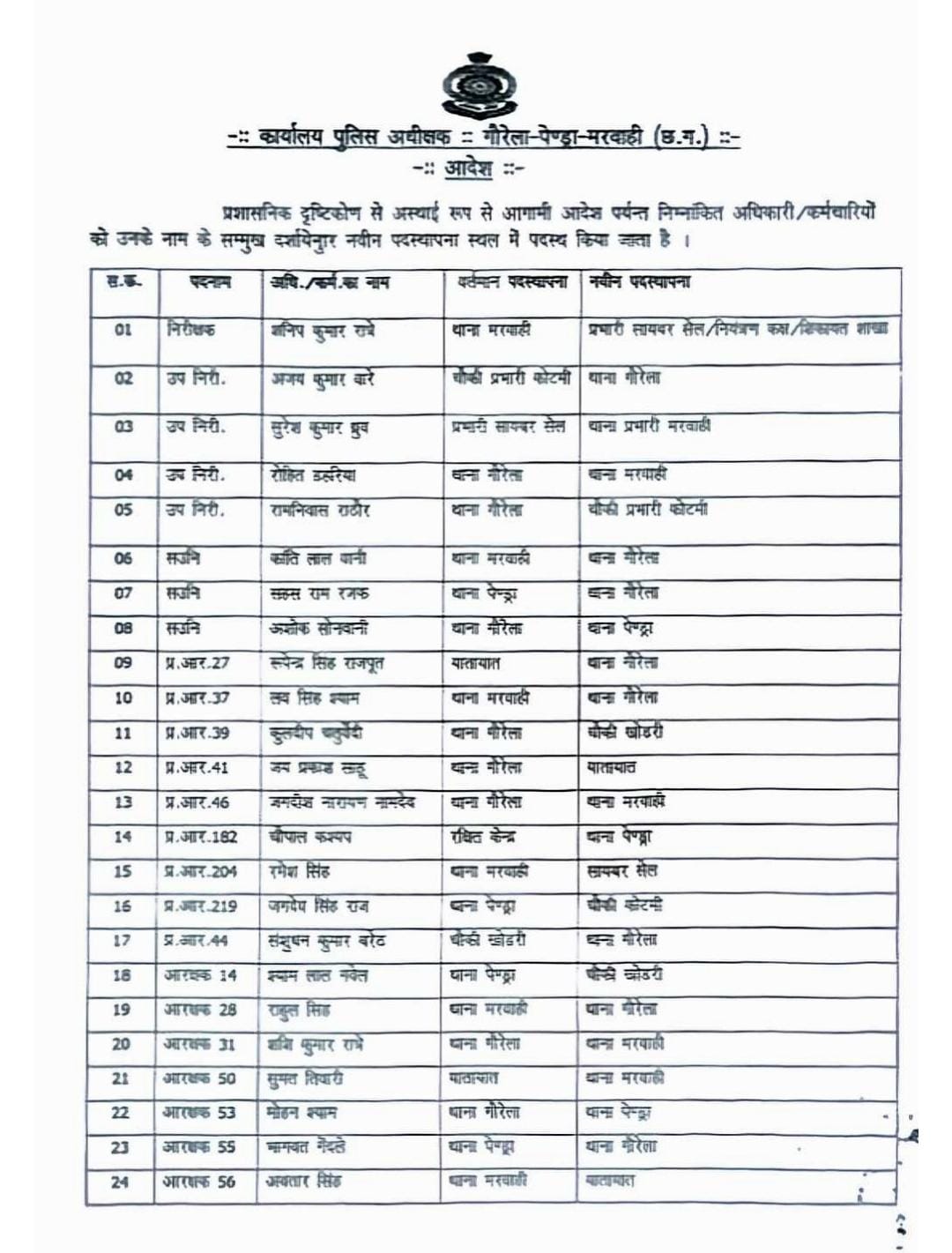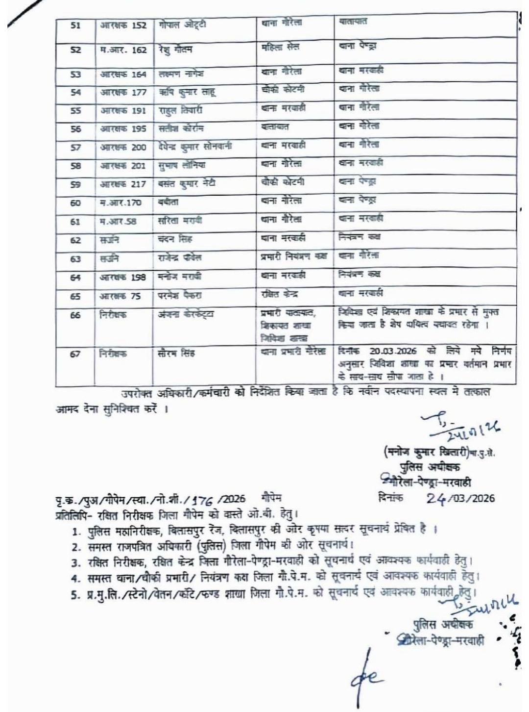 जिला गौरेला पेंड्रा मरवाही के पुलिस अधीक्षक मनोज कुमार खिलारी ने बड़ा प्रशासनिक बदलाव करते हुए 67 पुलिस अधिकारियों कर्मचारियों को एक साथ स्थानांतरण करते हुए नवीन पदस्थापना सौंपी है।
