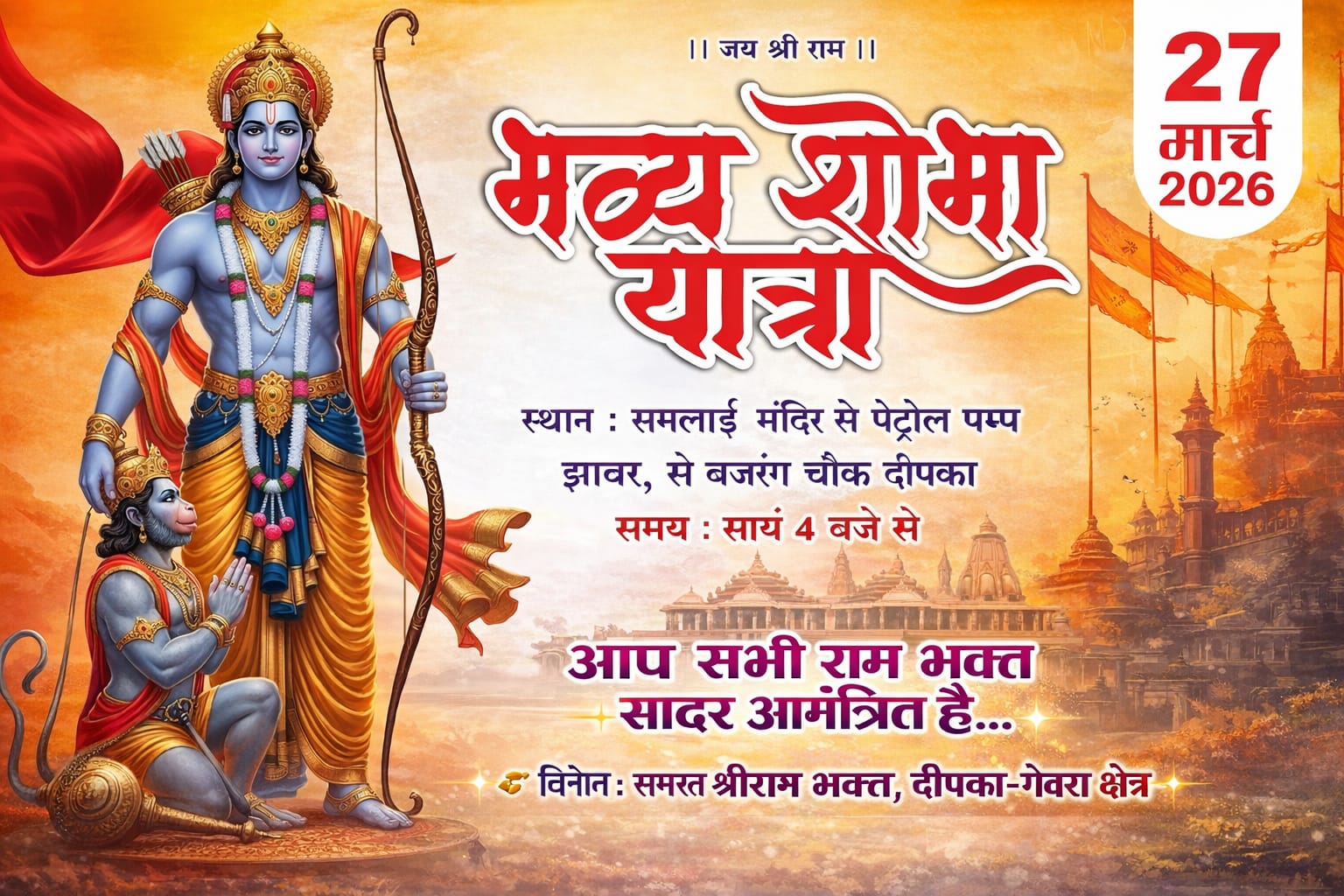 राम भक्तों का मनोबल बढ़ाते हुए भारतीय जनता पार्टी के नेता और पूर्व खाद्य आयोग के अध्यक्ष ज्योति नंद दुबे ने इस आयोजन को लेकर समस्त दीपका वासियों से इस शोभायात्रा में शामिल होकर नगर को राममय में करने की अपील भी की है