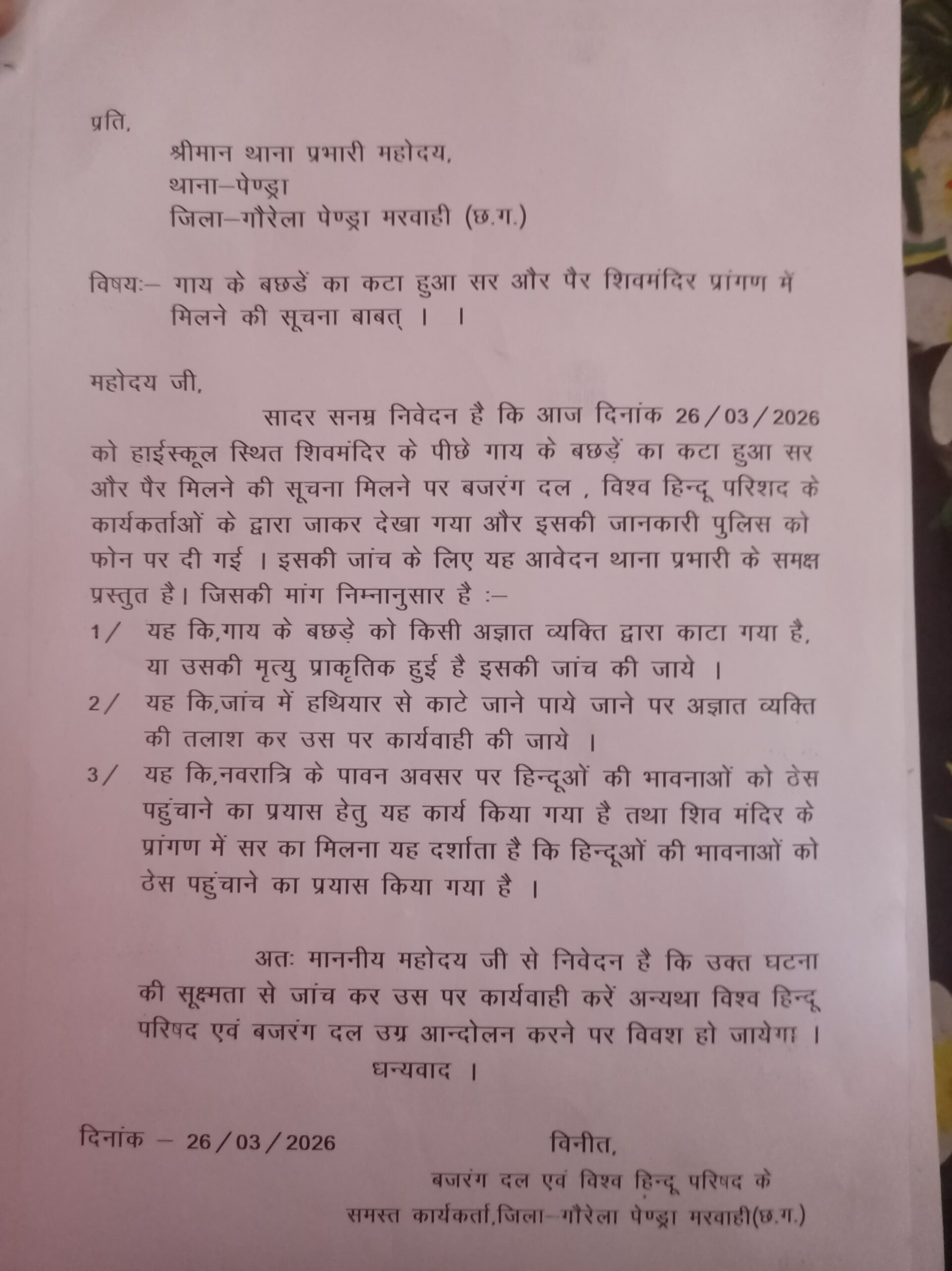 पेंड्रा: आज पेंड्रा क्षेत्र के हाईस्कूल स्थित प्राचीन शिव मंदिर परिसर में गोवंश (गाय के बछड़े) का कटा हुआ सिर और पैर मिलने से क्षेत्र में भारी आक्रोश व्याप्त हो गया है। इस घटना की जानकारी मिलते ही विश्व हिन्दू परिषद (विहिप) और बजरंग दल के कार्यकर्ता बड़ी संख्या में मौके पर पहुंचे और पुलिस प्रशासन को सूचित किया।संगठनों द्वारा जारी बयान के अनुसार, आज दिनांक 26/03/2026 को मंदिर के पिछले हिस्से में गोवंश के कटे हुए अंग देखे गए। हिंदू संगठनों का आरोप है कि नवरात्रि के पावन पर्व के दौरान इस तरह की घटना को अंजाम देना न केवल धार्मिक सौहार्द बिगाड़ने की कोशिश है, बल्कि यह सीधे तौर पर हिंदू भावनाओं को आहत करने का एक षड्यंत्र है।बजरंग दल और विश्व हिन्दू परिषद के जिला पदाधिकारियों ने थाना प्रभारी (पेंड्रा) को सौंपे गए ज्ञापन में निम्नलिखित मांगें रखी हैं: