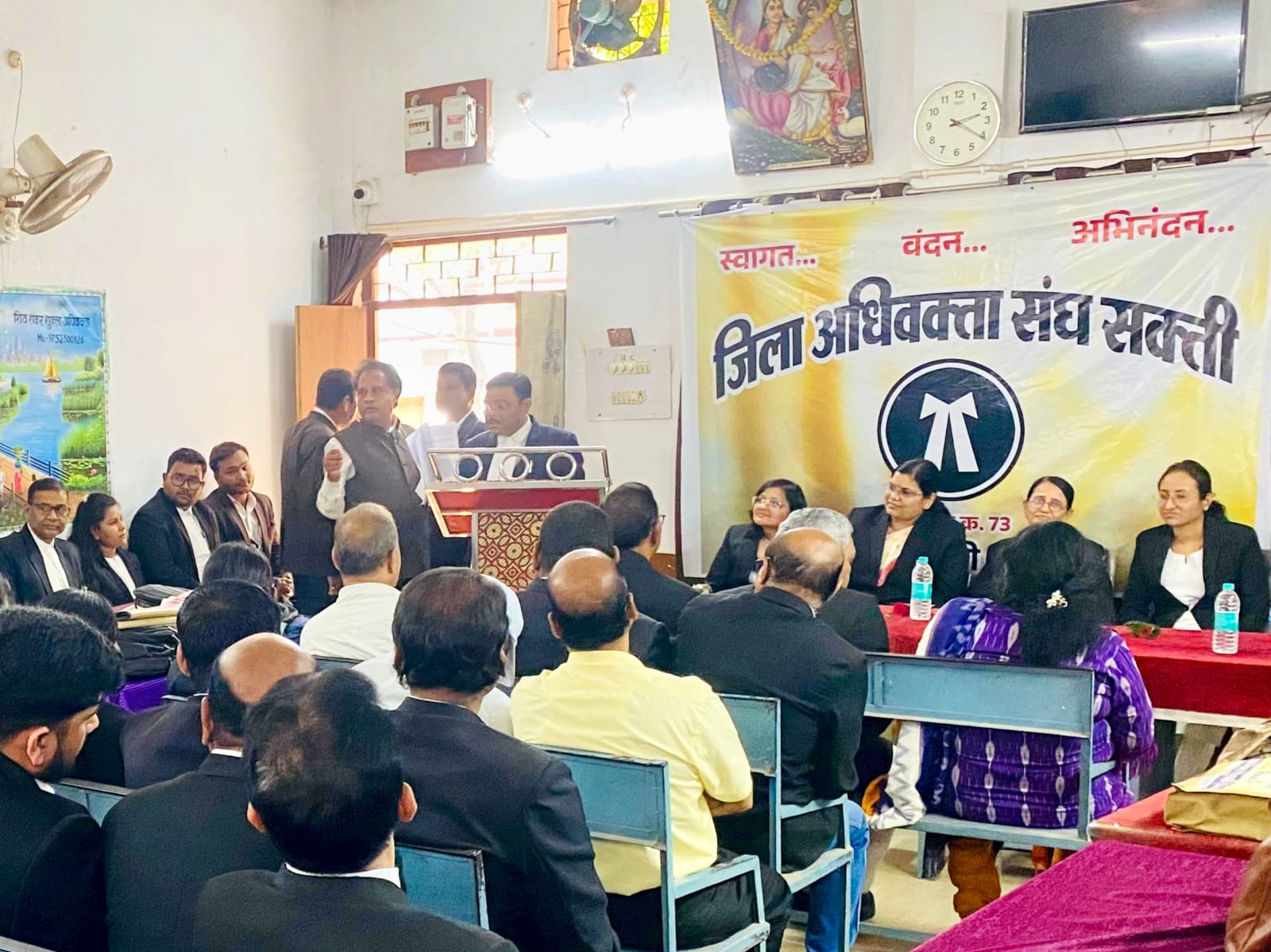 जिला अधिवक्ता संघ शक्ति द्वारा विदाई समारोह के शुभारंभ में मंचासिन अतिथि न्यायाधीशों का पुष्प भेंट कर अभिनंदन किया गया।