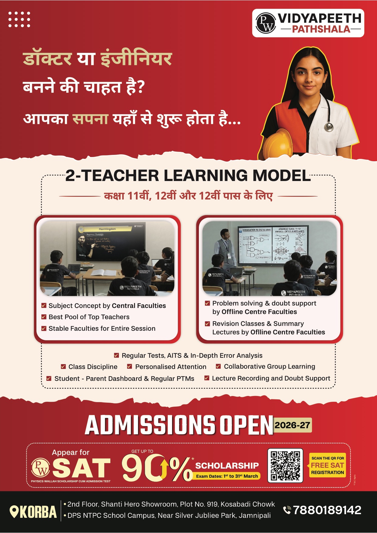 छत्तीसगढ़ के औद्योगिक शहर कोरबा में अब छात्रों को उच्च गुणवत्ता की शिक्षा के लिए बड़े शहरों पर निर्भर नहीं रहना पड़ेगा। देश के प्रमुख एडटेक प्लेटफॉर्म Physics Wallah ने अपने विद्यापीठ पाठशाला, कोरबा केंद्र के माध्यम से Academic Session 2026–27 के लिए एडमिशन प्रक्रिया शुरू कर दी है।