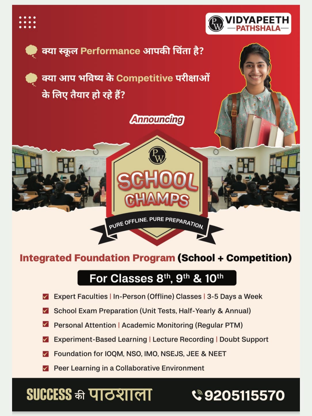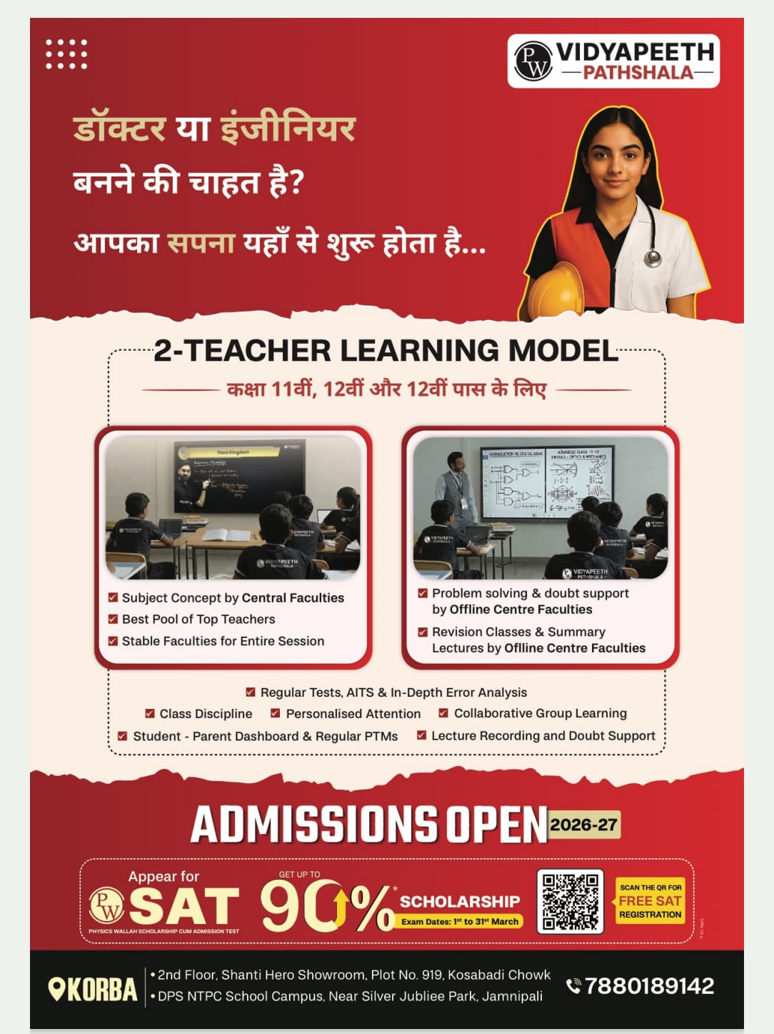 छत्तीसगढ़ के औद्योगिक शहर कोरबा में अब छात्रों को उच्च गुणवत्ता की शिक्षा के लिए बड़े शहरों पर निर्भर नहीं रहना पड़ेगा। देश के प्रमुख एडटेक प्लेटफॉर्म Physics Wallah ने अपने विद्यापीठ पाठशाला, कोरबा केंद्र के माध्यम से *Academic Session 2026–27 के लिए एडमिशन प्रक्रिया शुरू कर दी है।*
