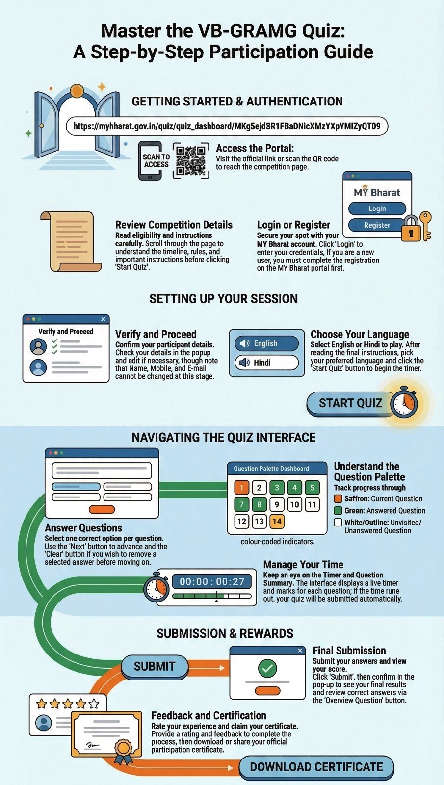 अभियान के अंतर्गत माय विलेज चैलेंज के नाम से राष्ट्रीय स्तर पर शॉर्ट वीडियो/रील प्रतियोगिता आयोजित की जा रही है। इसमें प्रतिभागी किसी भी भारतीय भाषा में 30 से 60 सेकंड की अवधि का वीडियो बनाकर माय भारत पोर्टल के माध्यम से ऑनलाइन अपलोड कर सकते हैं। वीडियो की अधिकतम साइज 25 एमबी निर्धारित की गई है। प्रतियोगिता में 15 से 29 वर्ष आयु वर्ग के युवा भाग ले सकते हैं। चयनित प्रतिभागियों को केंद्रीय ग्रामीण विकास मंत्रालय, भारत सरकार के कार्यक्रम में अपने अनुभव साझा करने का अवसर भी मिलेगा। इसी प्रकार माय भारत पोर्टल पर विकसित भारत जी राम जी अधिनियम से संबंधित क्विज प्रतियोगिता का भी आयोजन किया जा रहा है। इसमें प्रतिभागियों को निर्धारित समय में 20 प्रश्नों के उत्तर देने होंगे। प्रतियोगिता में भाग लेने वाले प्रतिभागियों को ऑनलाइन प्रमाण पत्र प्रदान किया जाएगा।