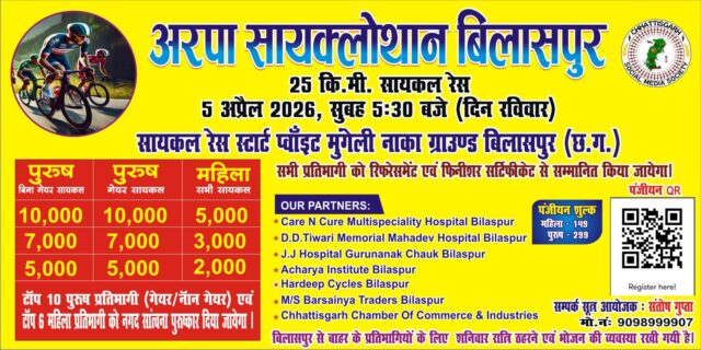 बिलासपुर,2 अप्रैल/फिटनेस, स्वास्थ्य और पर्यावरण के लिए ईंधन बचत के लिए साइक्लिंग संस्कृति को प्रोत्साहित करने के उद्देश्य से “अरपा सायक्लोथॉन बिलासपुर 2026” का आयोजन आगामी 5 अप्रैल को किया जाएगा। सुबह 5.30 मिनट पर शुरू होने वाली 25 किलोमीटर लंबी इस सायक्लोथॉन रेस का शुभारंभ मुंगेली नाका ग्राउंड, बिलासपुर से होगा। कलेक्टर श्री संजय अग्रवाल और वरिष्ठ पुलिस अधीक्षक श्री रजनेश सिंह ने नागरिकों से आयोजन में भागीदारी की अपील की है।