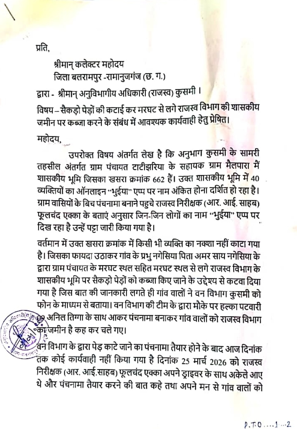 कुसमी। बलरामपुर – रामानुजगंज जिला के सामरी तहसील अंतर्गत ग्राम पंचायत टाटीझरिया के सहायक ग्राम मैलपारा में शासकीय भूमि पर कथित कब्जे और सैकड़ों पेड़ों की अवैध कटाई का मामला सामने आया है। इस पूरे घटनाक्रम से ग्रामीणों में भारी आक्रोश व्याप्त है और उन्होंने दिनांक 1 अप्रैल दिन बुधवार को कलेक्टर बलरामपुर के नाम पर कुसमी एसडीएम को आवेदन देकर सख्त कार्रवाई की मांग की है।