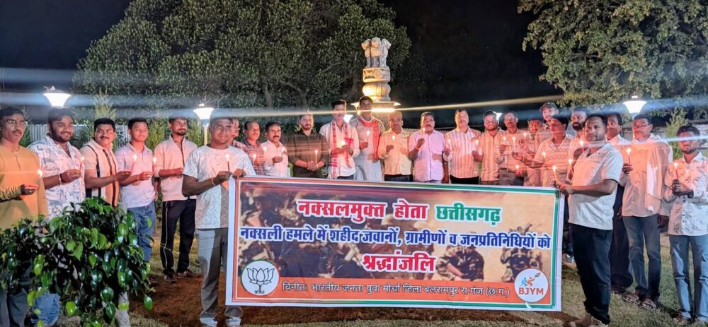 बलरामपुर। भारतीय जनता युवा मोर्चा, बलरामपुर द्वारा छत्तीसगढ़ के नक्सल मुक्त होने की ऐतिहासिक उपलब्धि के उपलक्ष्य में शहीद हुए वीर जवानों की पावन स्मृति में बुधवार को चांदो चौक, बलरामपुर स्थित शहीद स्मारक पर श्रद्धांजलि एवं दीपदान कार्यक्रम का आयोजन किया गया।