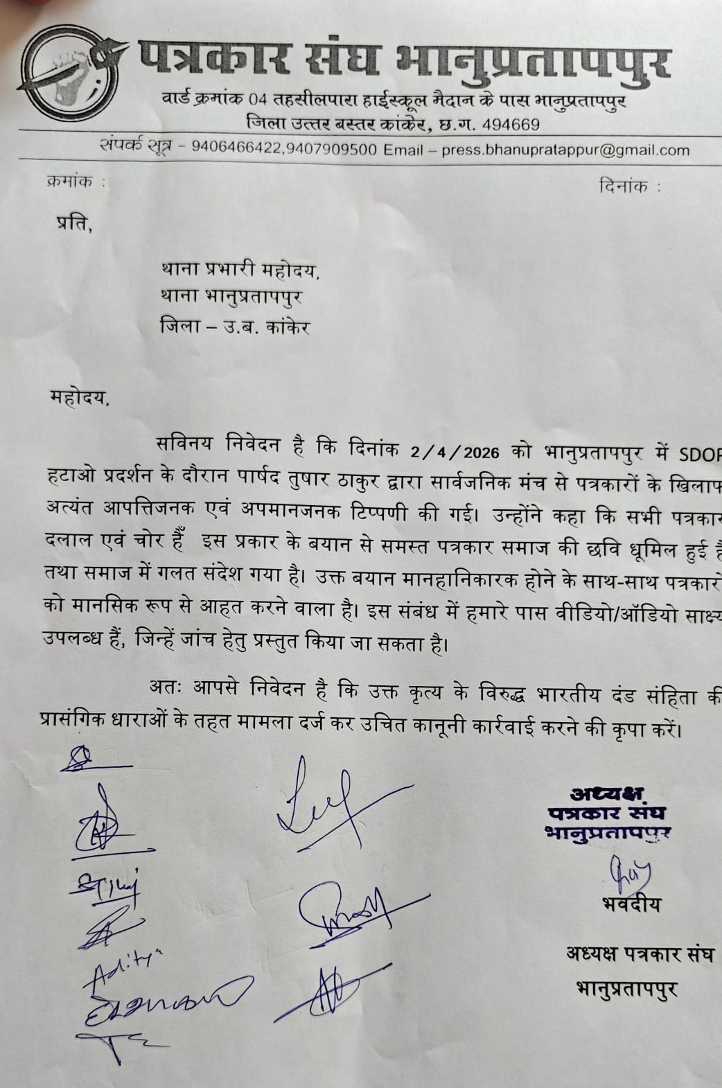 श्री कोर्राम ने बताया कि सरपंच कोर्ट के आदेश को मानने को तैयार नहीं हैं।सरपंच द्वारा कहा जाता है कि कोर्ट का आदेश रद्दी कागज का टुकड़ा है, हम पंचायत के प्रस्ताव को सर्वोपरि मानते हैं। श्री कोर्राम ने बताया कि सरपंच के खिलाफ जिला प्रशासन एवं पुलिस विभाग को शिकायत की जा चुकी है। सरपंच के खिलाफ कार्रवाई नहीं होने पर उग्र आंदोलन करने की चेतावनी दी गई है।पत्रकार भवन में पत्रकारों से चर्चा करते हुए पूर्व सरपंच कामता कोर्राम एवं ग्रामीणों ने बताया कि वर्तमान सरपंच द्वारा मंदिर का हवाला देकर एक गरीब महिला के आवास को जेसीबी से तोड़ दिया गया है। जबकि उक्त महिला को वनाधिकार पट्टा मिला हुआ है। इसी प्रकार अन्य 6 लोगों की दुकानों पर बुलडोजर चला दिया गया है। पूर्व सरपंच श्री कोर्राम और ग्रामीणों ने मौजूदा सरपंच पर पद की आड़ में दबंगई दिखाने का आरोप लगाया है। श्री कोर्राम ने बताया कि लोगों को अतिक्रमण के नाम पर आपस में लड़ाकर गांव की शांति व्यवस्था को भंग करने का प्रयास किया जा रहा है। उन्होंने बताया कि 6 व्यापारियों की दुकानें तोड़ने का फरमान जारी किया गया है जबकि सभी ने हाईकोर्ट से स्टे ले रखा है। उक्त स्टे ऑर्डर को भी सरपंच मानने को तैयार नहीं है।