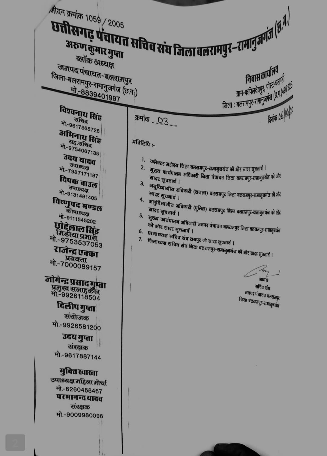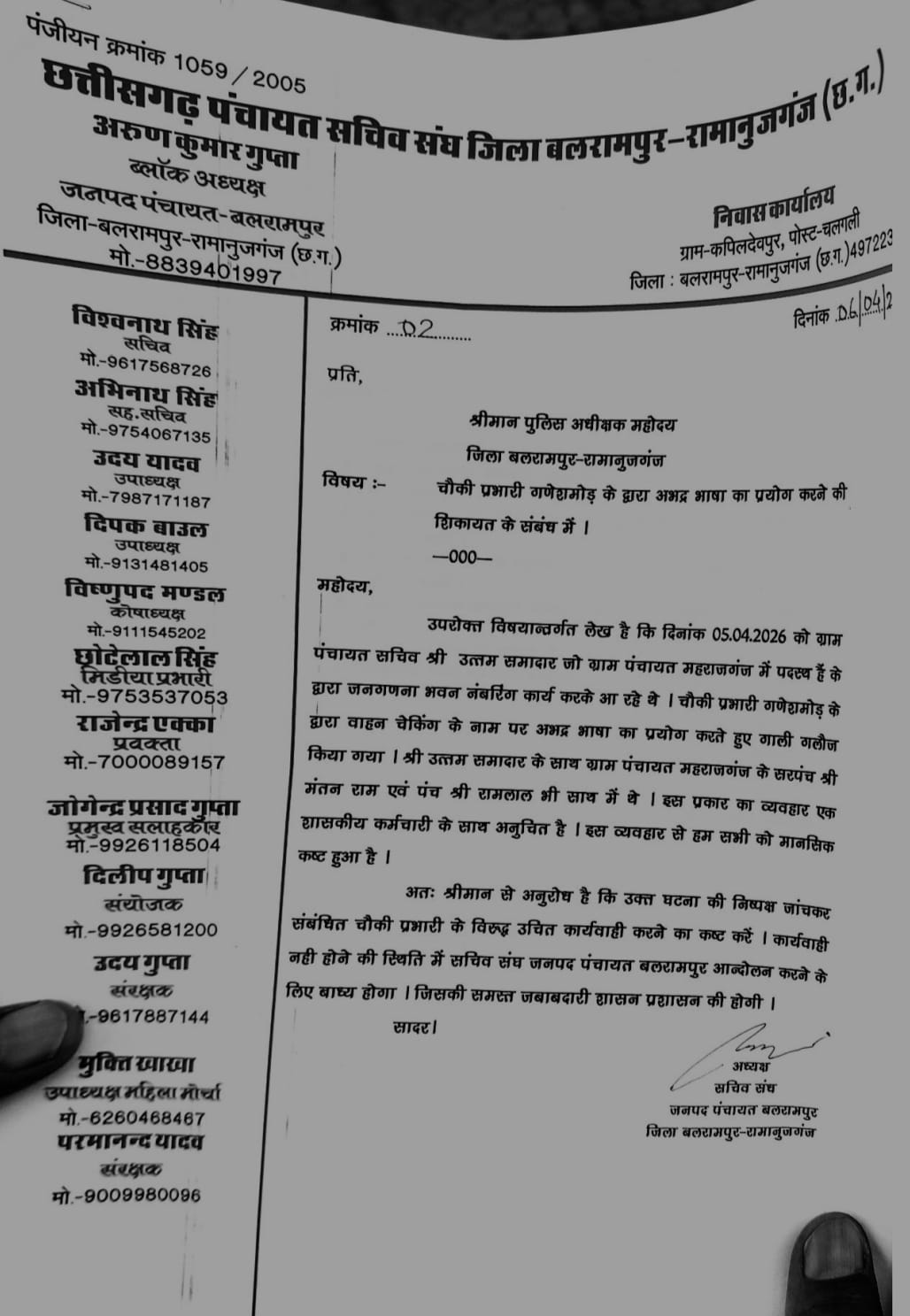 बलरामपुर-रामानुजगंज। छत्तीसगढ़ पंचायत सचिव संघ, जिला बलरामपुर-रामानुजगंज ने चौकी प्रभारी गणेशगढ़ पर अभद्र व्यवहार का आरोप लगाते हुए पुलिस अधीक्षक को लिखित शिकायत सौंपी है। संघ ने मामले की निष्पक्ष जांच कर संबंधित अधिकारी के विरुद्ध उचित कार्रवाई की मांग की है।