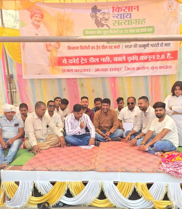 आरंग: केंद्र सरकार की कथित किसान विरोधी नीतियों और विवादित ट्रेड डील्स के खिलाफ रायपुर जिला ग्रामीण युवा कांग्रेस ने आरपार की लड़ाई का बिगुल फूंक दिया है। युवा कांग्रेस प्रदेश प्रभारी अमित पठानिया,सह प्रभारी मोनिका मांडरे के निर्देश पर पूर्व कैबिनेट मंत्री डॉ शिवकुमार डहरिया एवं युवा कांग्रेस प्रदेश अध्यक्ष आकाश शर्मा के मार्गदर्शन में गुरुवार को आरंग विधानसभा क्षेत्र में “किसान न्याय सत्याग्रह” के प्रथम दिवस का आयोजन किया गया। इस दौरान सैकड़ों की संख्या में उपस्थित युवा कांग्रेस कार्यकर्ताओं ने केंद्र सरकार के खिलाफ जमकर नारेबाजी की और किसानों के हितों की रक्षा के लिए संकल्प लिया।