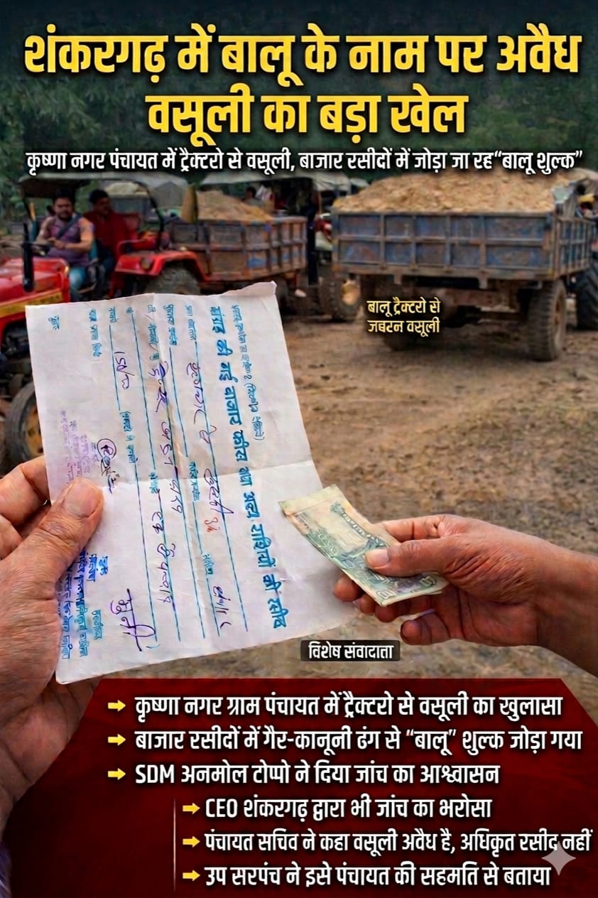 जनपद पंचायत शंकरगढ़ के अंतर्गत ग्राम पंचायत कृष्णा नगर में बालू परिवहन के नाम पर अवैध वसूली का बड़ा मामला उजागर हुआ है। आरोप है कि पंचायत स्तर पर ट्रैक्टर चालकों और बालू कारोबारियों से पर्ची काटकर मनमाने तरीके से पैसे वसूले जा रहे हैं, जबकि इस तरह की वसूली का कोई वैधानिक आधार नहीं है।