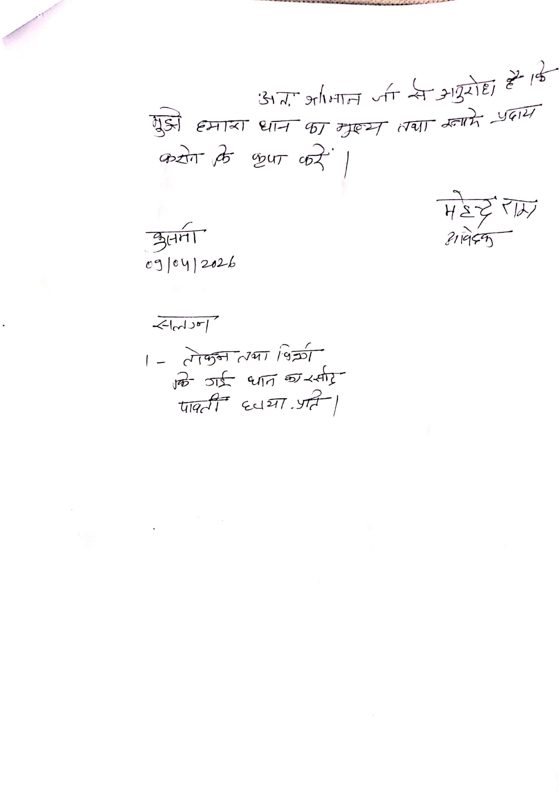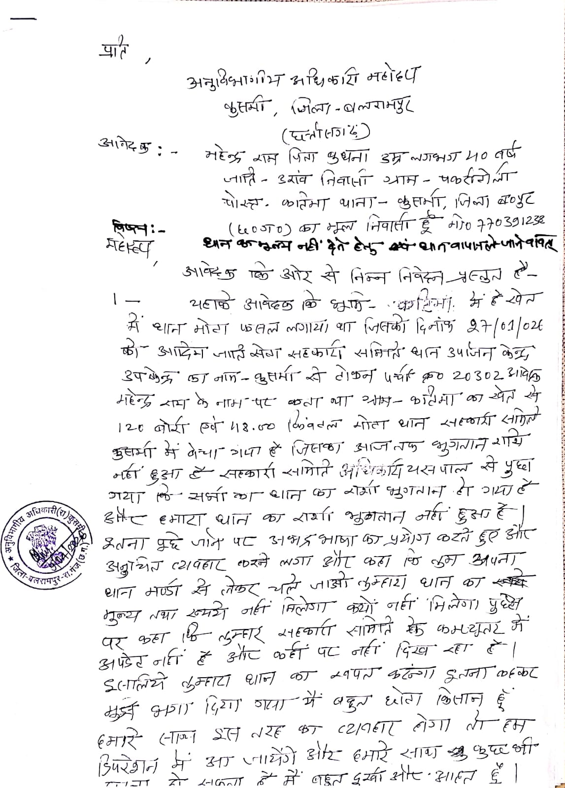 कुसमी। विकासखंड कुसमी अंतर्गत धान मंडी कुसमी में एक किसान ने भुगतान नहीं मिलने और अभद्र व्यवहार का आरोप लगाते हुए अनुविभागीय अधिकारी (एसडीएम) को लिखित शिकायत सौंपी है। मामले में किसान ने न्याय की मांग करते हुए गंभीर मानसिक तनाव की बात कही है।