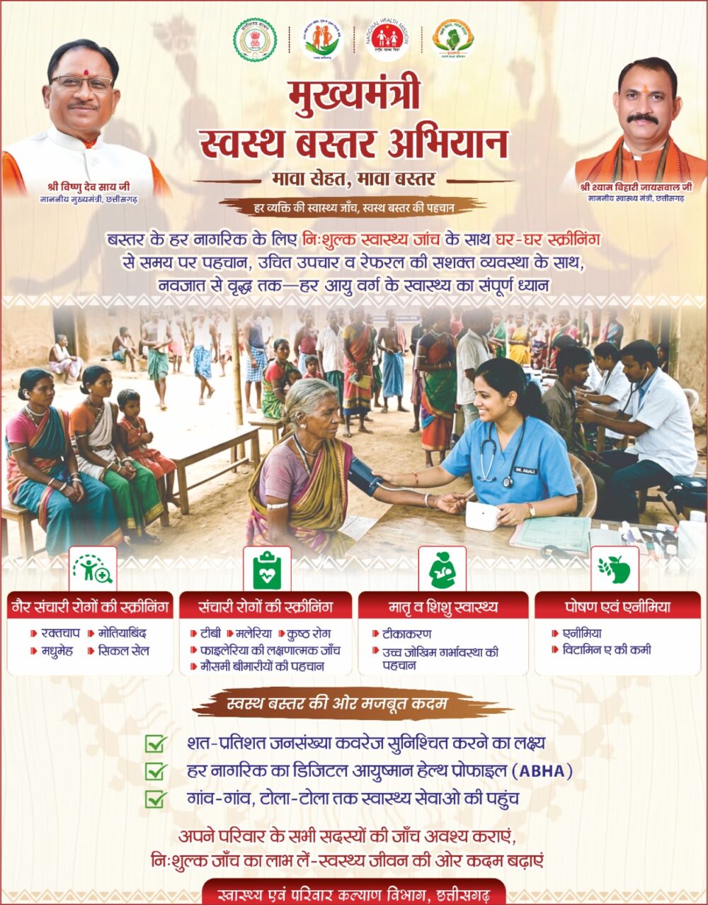 बीजापुर 13 अप्रैल 2026/ मुख्यमंत्री श्री विष्णु देव साय द्वारा 13 अप्रैल से मुख्यमंत्री स्वस्थ बस्तर अभियान की शुरुआत सुकमा जिले से कर दी गयी है इसके साथ ही बस्तर संभाग के अन्य जिलों के साथ- साथ बीजापुर में भी अभियान की शुरुआत हो गयी है मुख्यमंत्री स्वस्थ बस्तर अभियान अंतर्गत स्वास्थ्य टीम द्वारा घर -घर जाकर सभी व्यक्तियों की स्वास्थ्य जांच (वजन, ऊँचाई, शुगर, बी.पी., मलेरिया, टी.बी., कुष्ट सहित आयुष्मान कार्ड व आभा आई डी बनाकर) कर डिजिटल हेल्थ प्रोफ़ाइल बनाया जायेगा । स्वास्थ्य विभाग व पंचायत विभाग ने अपनी तैयारी पूर्ण कर ली है।