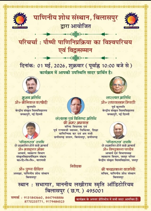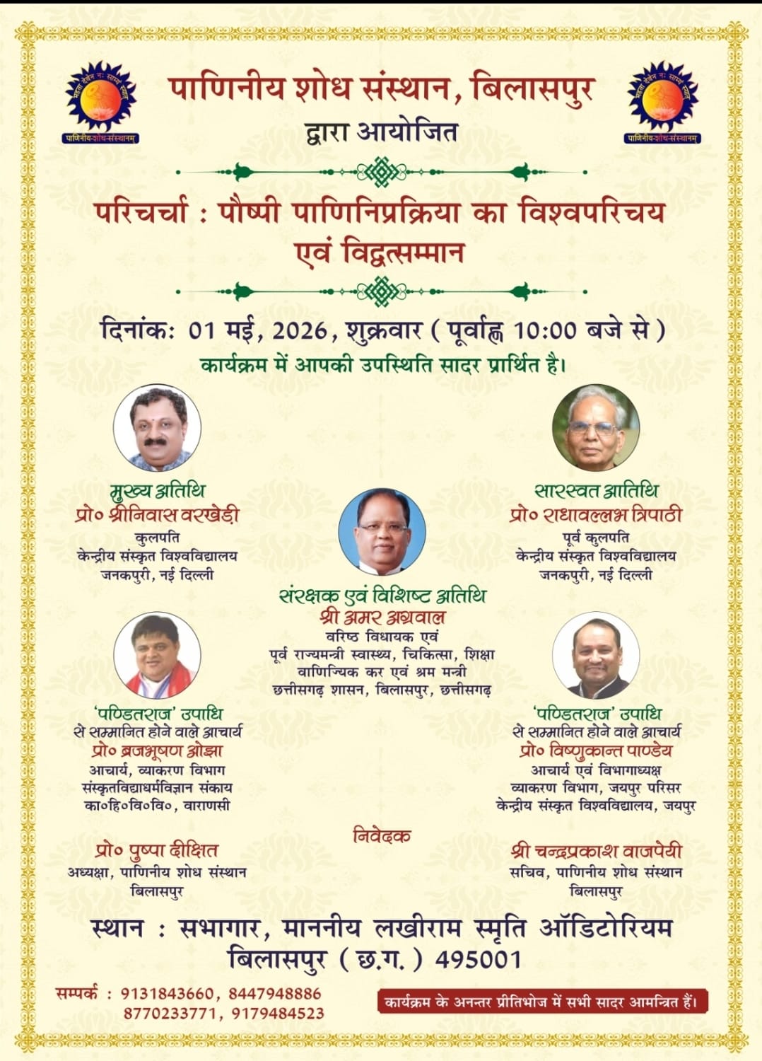 बसंत राघव/बिलासपुर, छत्तीसगढ़। 13 अप्रैल, 2026 पाणिनीय शोध संस्थान, बिलासपुर के तत्वावधान में आगामी 01 मई, को एक भव्य बौद्धिक एवं सम्मान समारोह का आयोजन किया जा रहा है। ‘पौष्पी पाणिनिप्रक्रिया का विश्वपरिचय एवं विद्वत्सम्मान’ विषय पर केंद्रित यह महत्वपूर्ण परिचर्चा स्थानीय माननीय लखीराम स्मृति ऑडिटोरियम में पूर्वाह्न 10:00 बजे से संपन्न होगी।