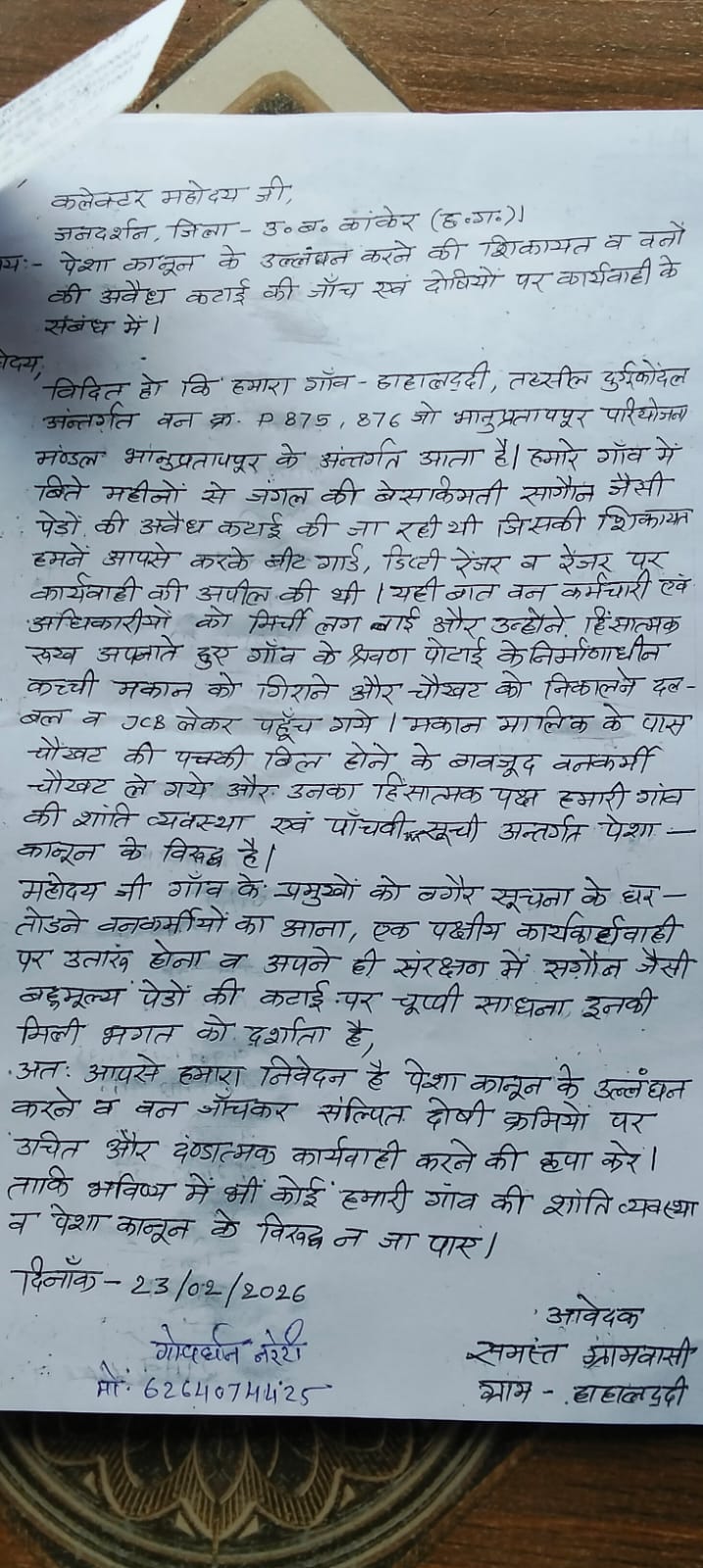 ग्रामीण सरवन पोटाई के अनुसार, मकान निर्माण के दौरान एक नग साझा लकड़ी काटी गई थी, जिसे वन विभाग के कर्मचारियों ने जब्त कर डिपो में जमा करा दिया। इसके बाद विभाग के कर्मचारियों द्वारा उनसे 25,000 रुपये (पी.ओ.आर. शुल्क) वसूले गए।