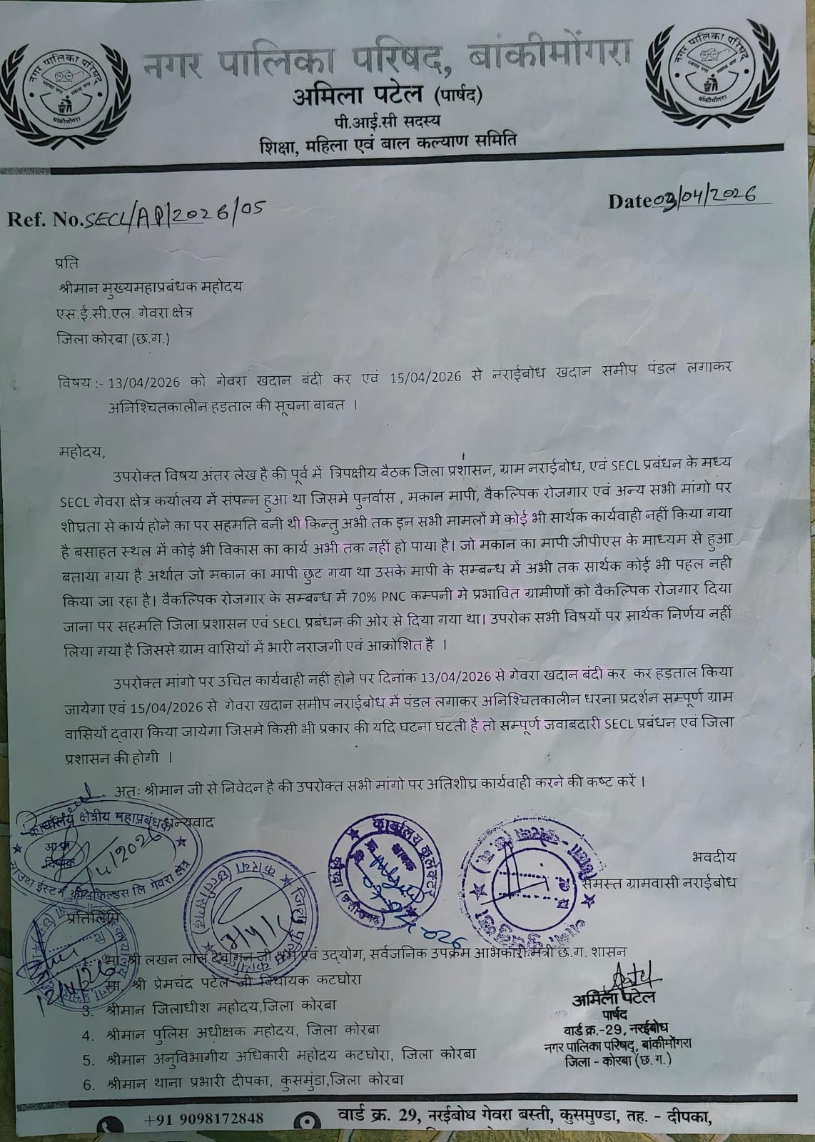 ग्रामीणों का कहना है कि पहले जिला प्रशासन, एसईसीएल प्रबंधन और ग्राम नराईबोध के बीच त्रिपक्षीय बैठक में कई बिंदुओं पर सहमति बनी थी, लेकिन जमीन पर काम नहीं हुआ। प्रमुख मांगें: