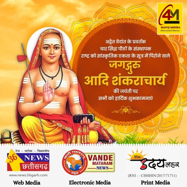 आज पूरे देश में जगतगुरु आदि शंकराचार्य की जयंती श्रद्धा और आस्था के साथ मनाई जा रही है। वे केवल एक संत ही नहीं, बल्कि सनातन धर्म के महान पुनरुद्धारक, अद्वैत वेदांत के प्रणेता और भारतीय आध्यात्मिक परंपरा के आधार स्तंभ माने जाते हैं।