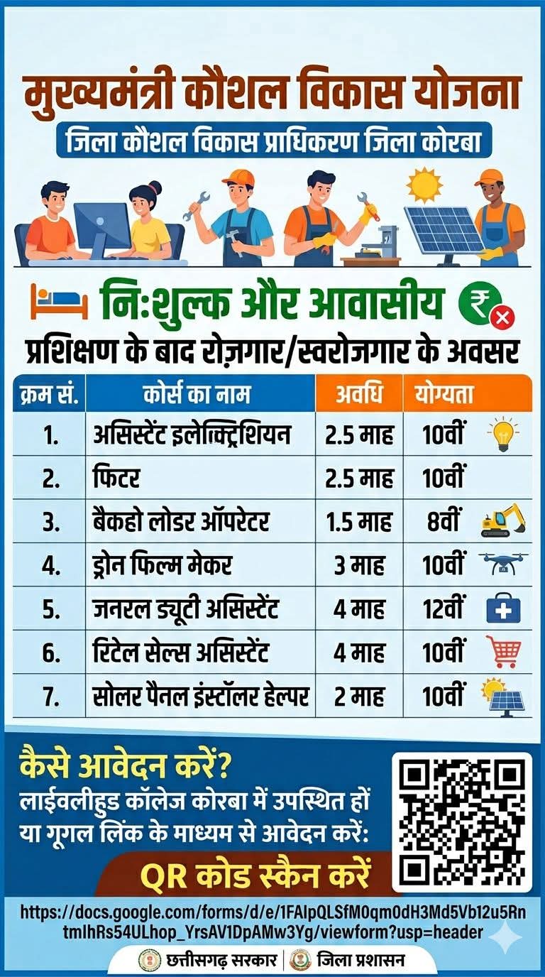 कोरबा न्यूज 36गढ़:– मुख्यमंत्री कौशल विकास योजना अंतर्गत जिला कौशल विकास प्राधिकरण, जिला कोरबा द्वारा संचालित लाईवलीहुड कॉलेज कोरबा तथा जिले के अन्य शासकीय प्रशिक्षण संस्थानों में विभिन्न विषयों में रोजगारोन्मुखी कौशल प्रशिक्षण प्रदान किया जाना है।