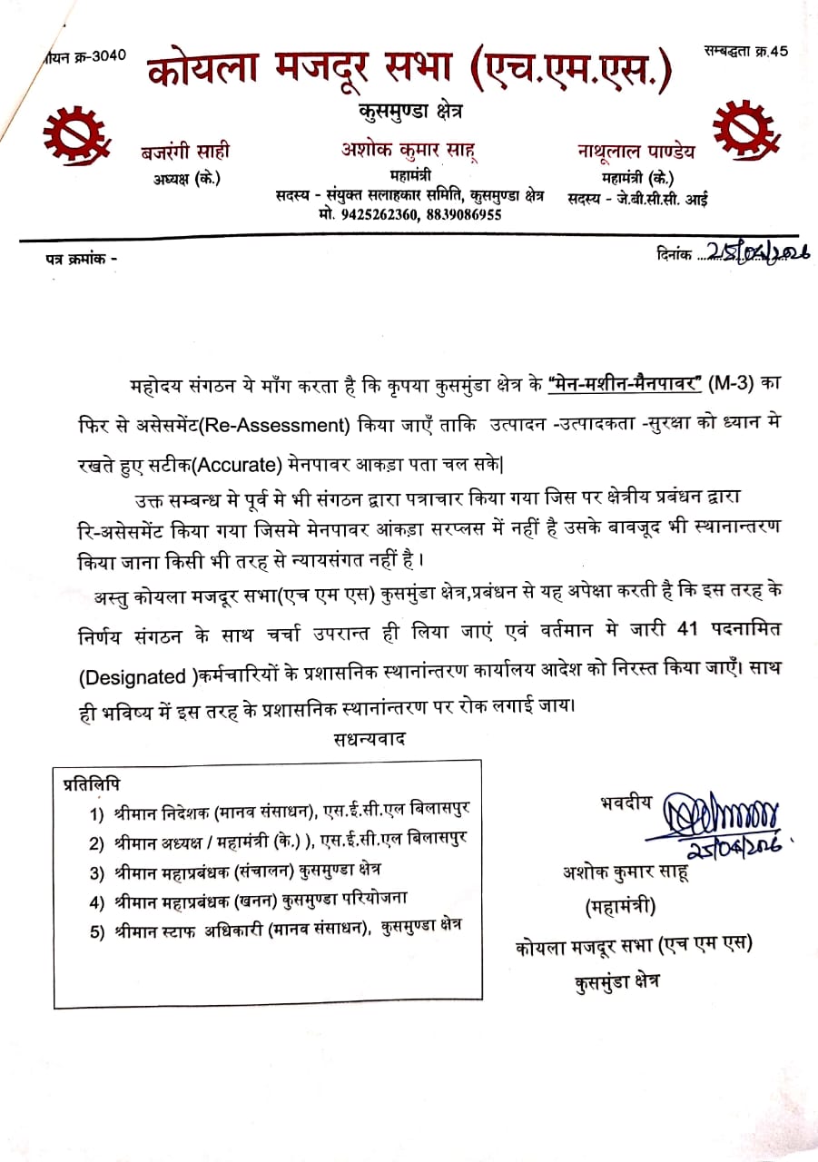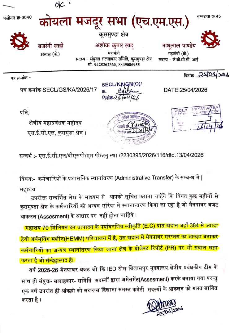 70 मेट्रिक टन उत्पादन क्षमता वाली कुसमुंडा खदान में मैनपावर सरप्लस घोषित किए जाने और 41 कर्मचारियों के प्रशासनिक तबादले को लेकर विवाद गहराता जा रहा है। कोयला मजदूर सभा के क्षेत्रीय महामंत्री अशोक कुमार साहू ने इस पूरे मामले पर गंभीर सवाल उठाते हुए प्रबंधन के फैसले को अव्यवहारिक और श्रमिक विरोधी बताया है।