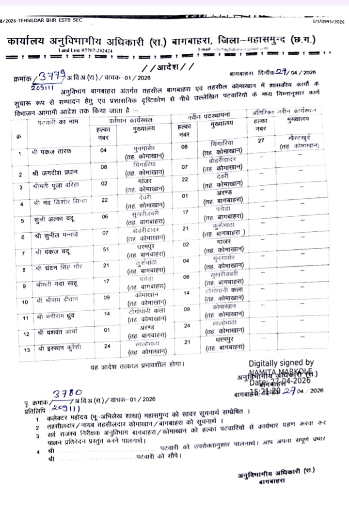 प्रशासनिक फेरबदल: बागबाहरा एसडीएम ने जारी की 13 पटवारियों की नई पदस्थापना सूची, कोमाखान और बागबाहरा तहसील में बड़े बदलाव